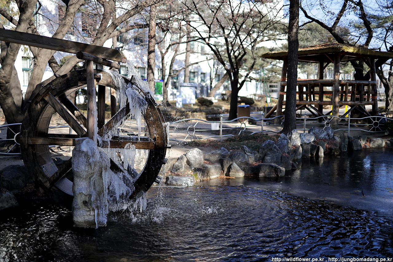 작은 연못에 물레방아가 힘차게 돌고 있습니다.