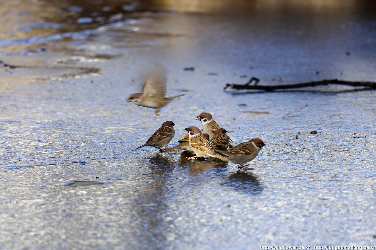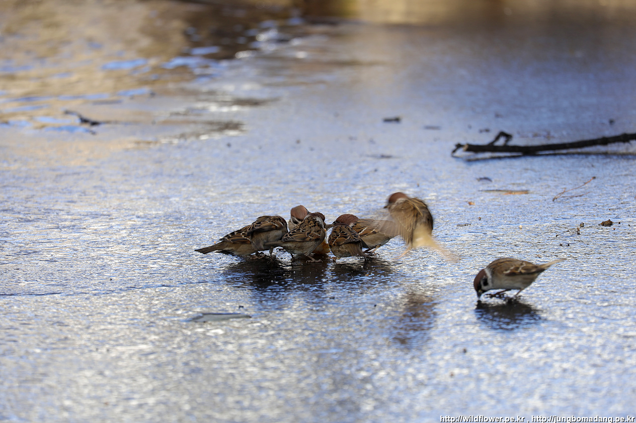 살얼음이 얼어있는 연못에 누군가 던져둔 빵 한조각을 두고 참새들간에 혈투가 벌어집니다.