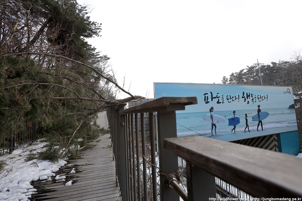1월 1일에 확인된 문제가 아직 해결이 안되었네요. 강릉 폭설로 나무도 많이 부러진 것으로 목격이 됩니다. 동해한 자전거길을 따라 걷고 있는 데, 부러진 나무가 길을 막고 있네요.