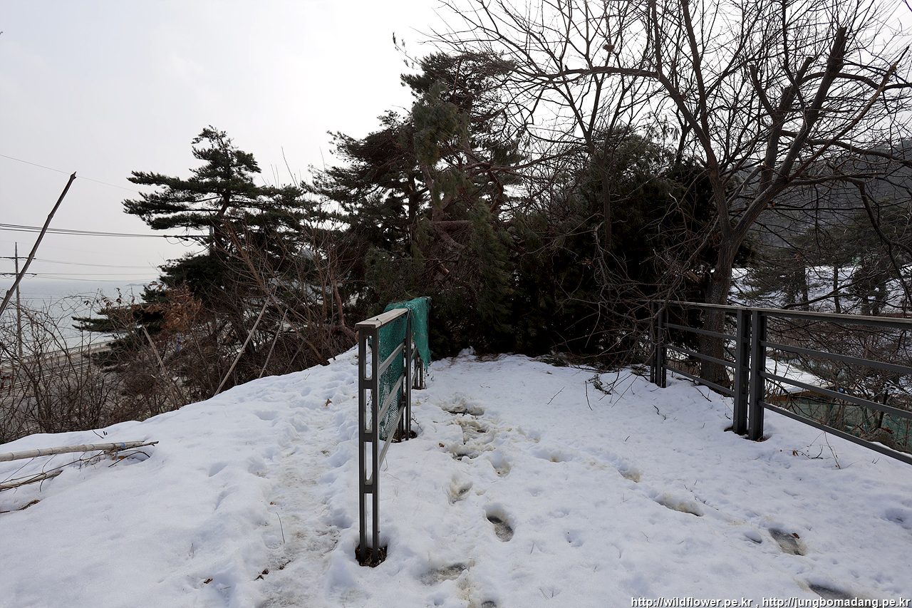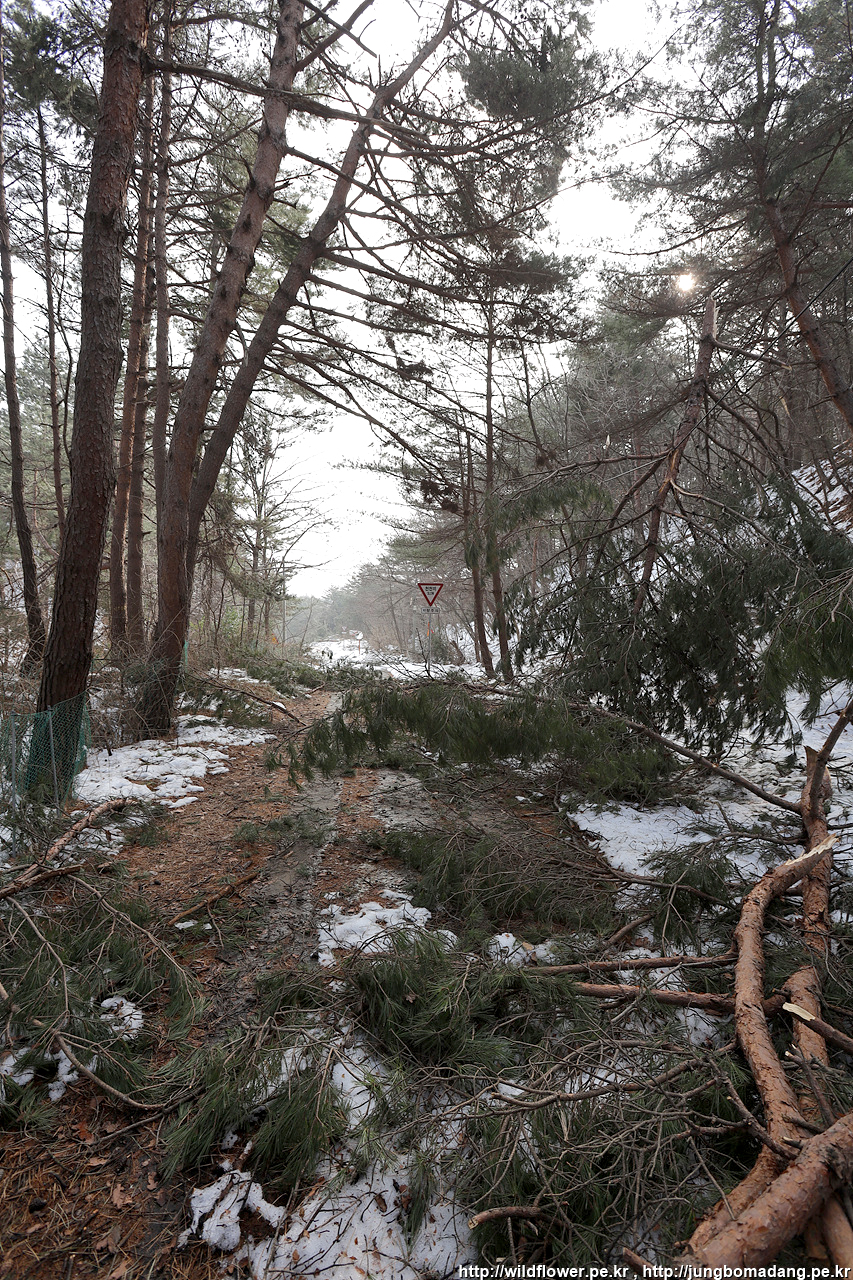 그도 그럴 것이 보시다시피 하조대전망대에서 나오는 이 길이 대나무가 쓰러져서 막혀 있습니다. 눈도 일부 길을 막고 있구요. 공무원들은 일을 안하는 거 같아요. 관광객(시민)들이 불편한 상황인 데, 특히 어르신들이 짧지 않은 이 길을 막혀 되돌아 가시는 것을 계속 막걸리에 안주 질겅 질겅 씹으면서 보니 도저히 안되겠는 거예요.