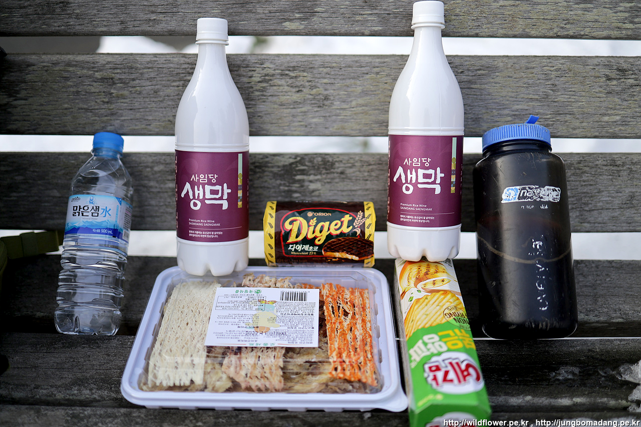 아까 문제의 그 해변(하조대전망대로 이동하는 길)이 잘 보이는 의자에 앉아 좀 전에 하나로마트를 털었던 것을 보며 흡족한 표정으로 막걸리 한병과 모듬마른안주를 질겅 징겅 씹고 있는 데,