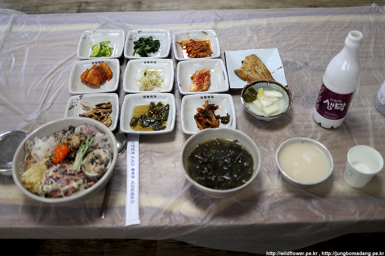 2만원 짜리 물회가 가성비가 맛이 끝내줍니다. 막걸리도 하나 시킵니다. 아래 소면이 빠졌네요.