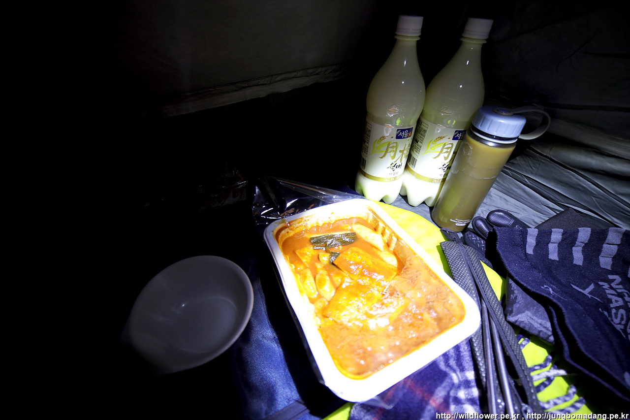 급격히 기온이 떨어져서 리액터 안 챙겨온 생각이 간절함을 느끼고, 무게 줄인다고 텐트도 좁은 1인 텐트 챙기니 공간도 협소하고, 막걸리에 사온 떡볶이 막 밀어 넣습니다. 생수병에는 직접 내린 원두커피에 우유 약간 넣어서 카페라떼를 챙겨 왔지만, 바로 못 먹고 담날 마셨습니다.