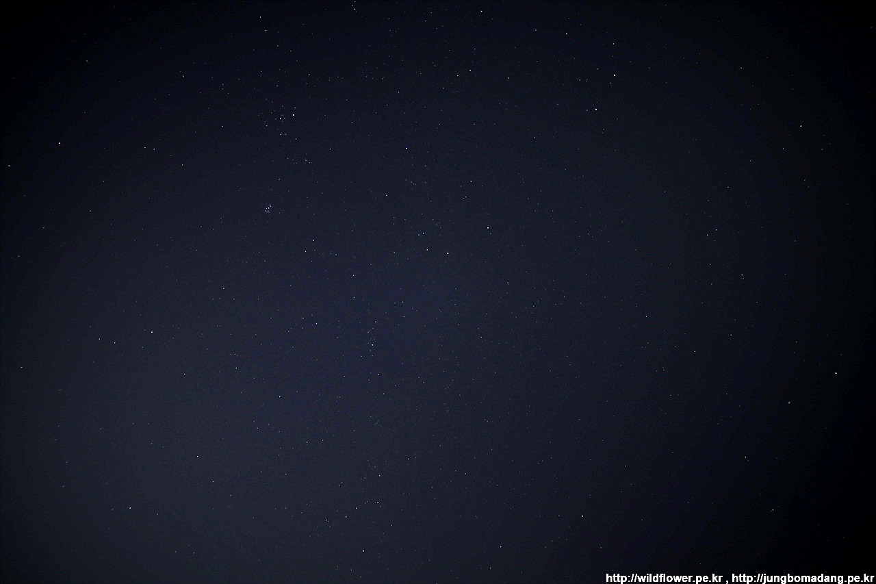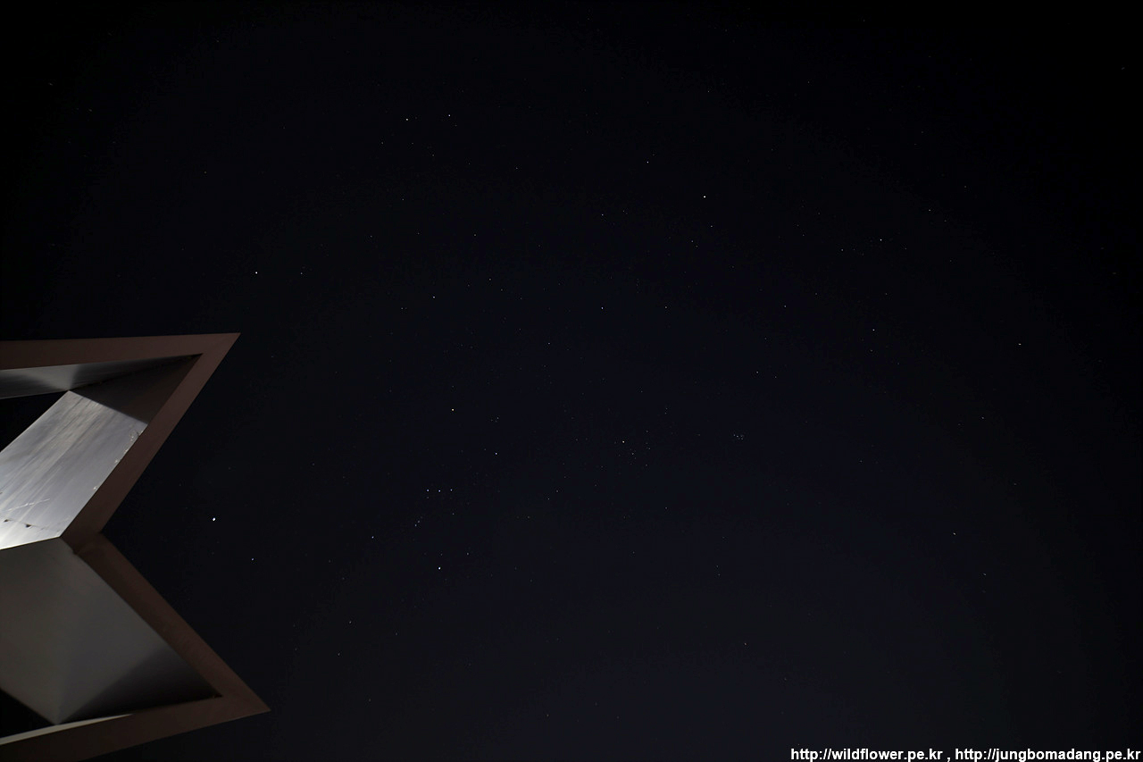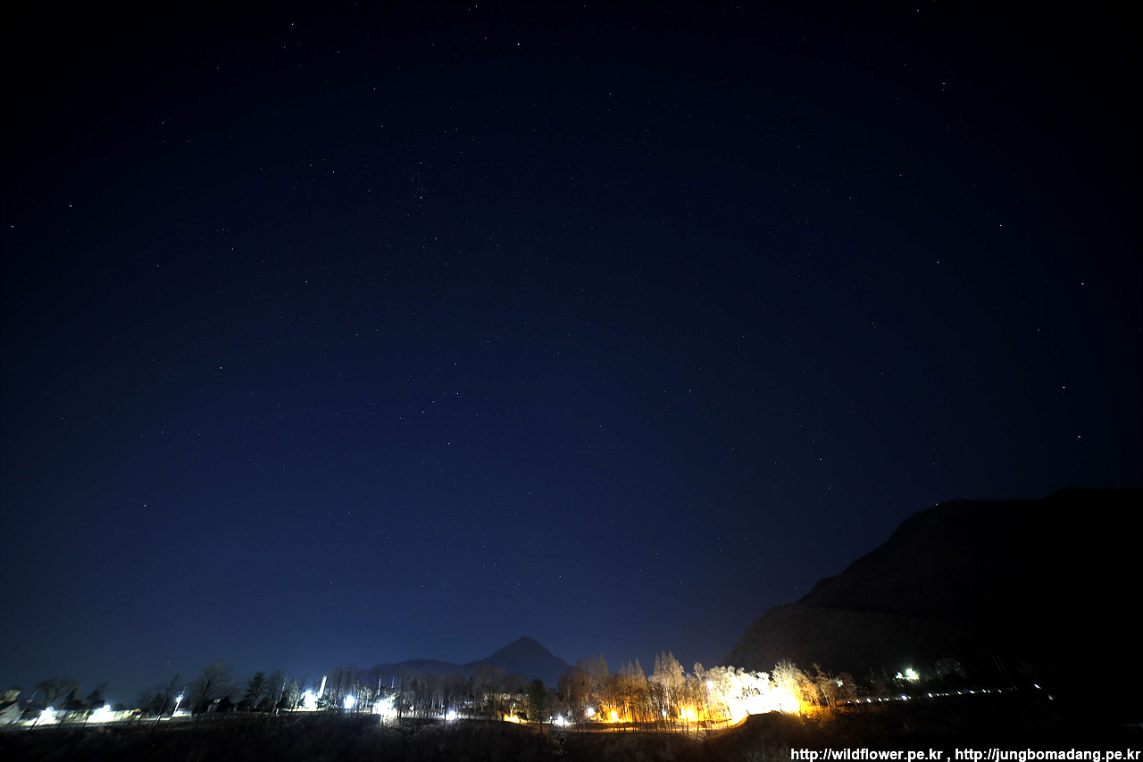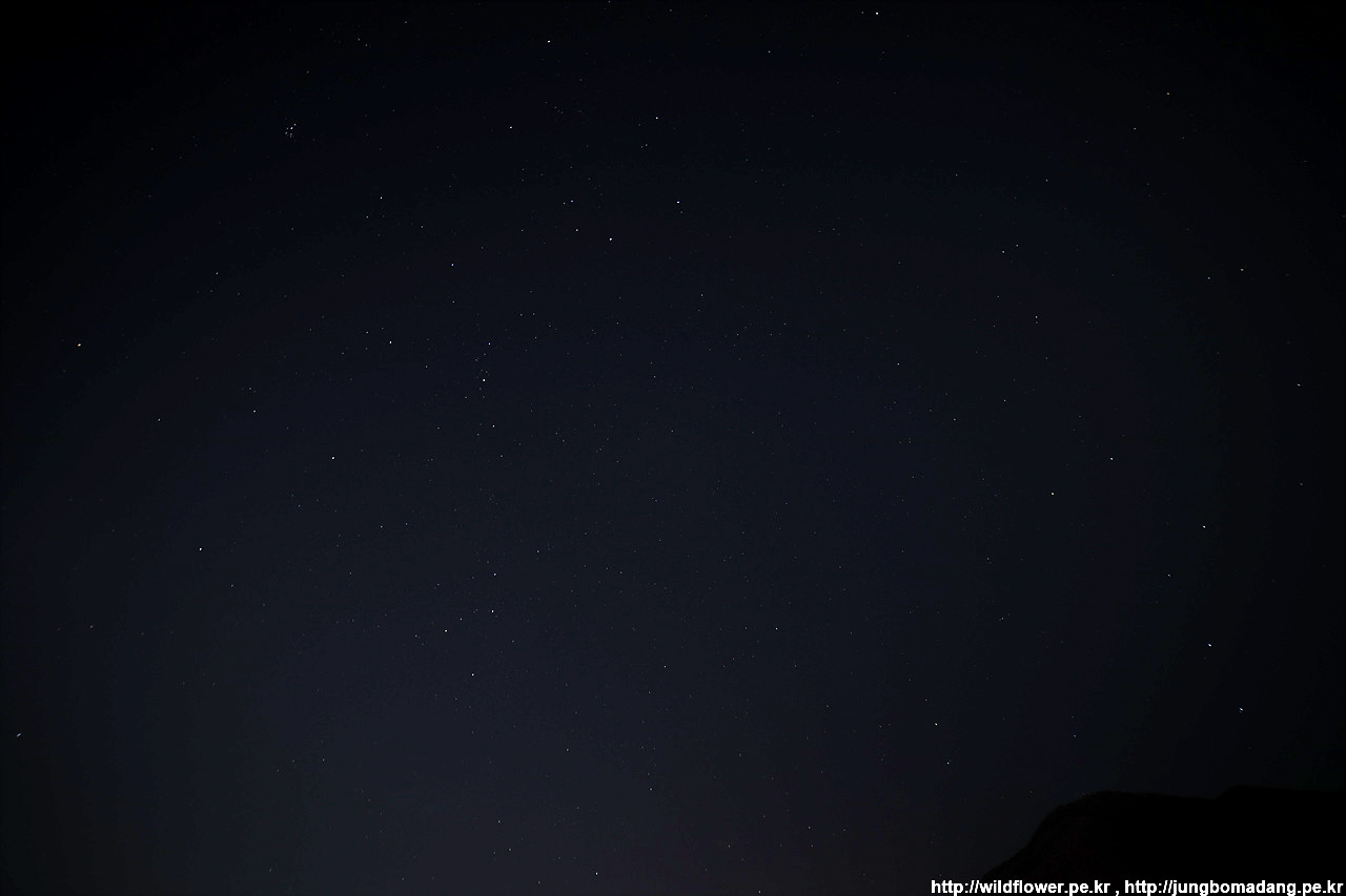 이별이 생각보다는 많이 안보이는 데, 그도 그럴 것이 음력 보름이 지난 지 며칠 안 되었고, 현재 위치한 곳이 동강이 흐르는 인접 도로여서 가로등도 많고 빛 간섭이 많은 이유입니다. 시간상 봉래산 위로 오를 수 없어 급하게 자리를 잡다 보니 그렇습니다. 우측 아래 검은 물체에 빨간 빛 있는 것이 별마로천문대가 있는 봉래산 정상입니다.