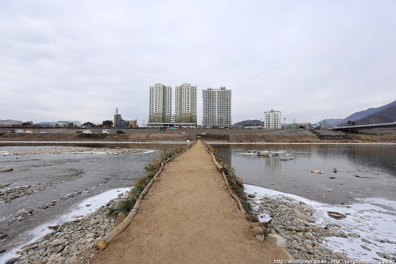 방금 전에 거닐었던 동강섶다리와 썰매 타는 가족