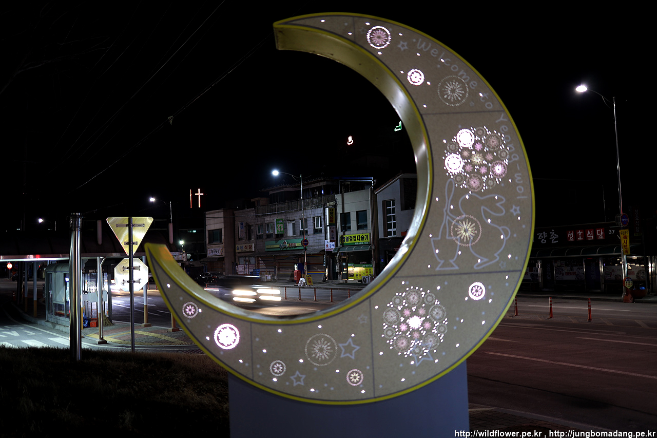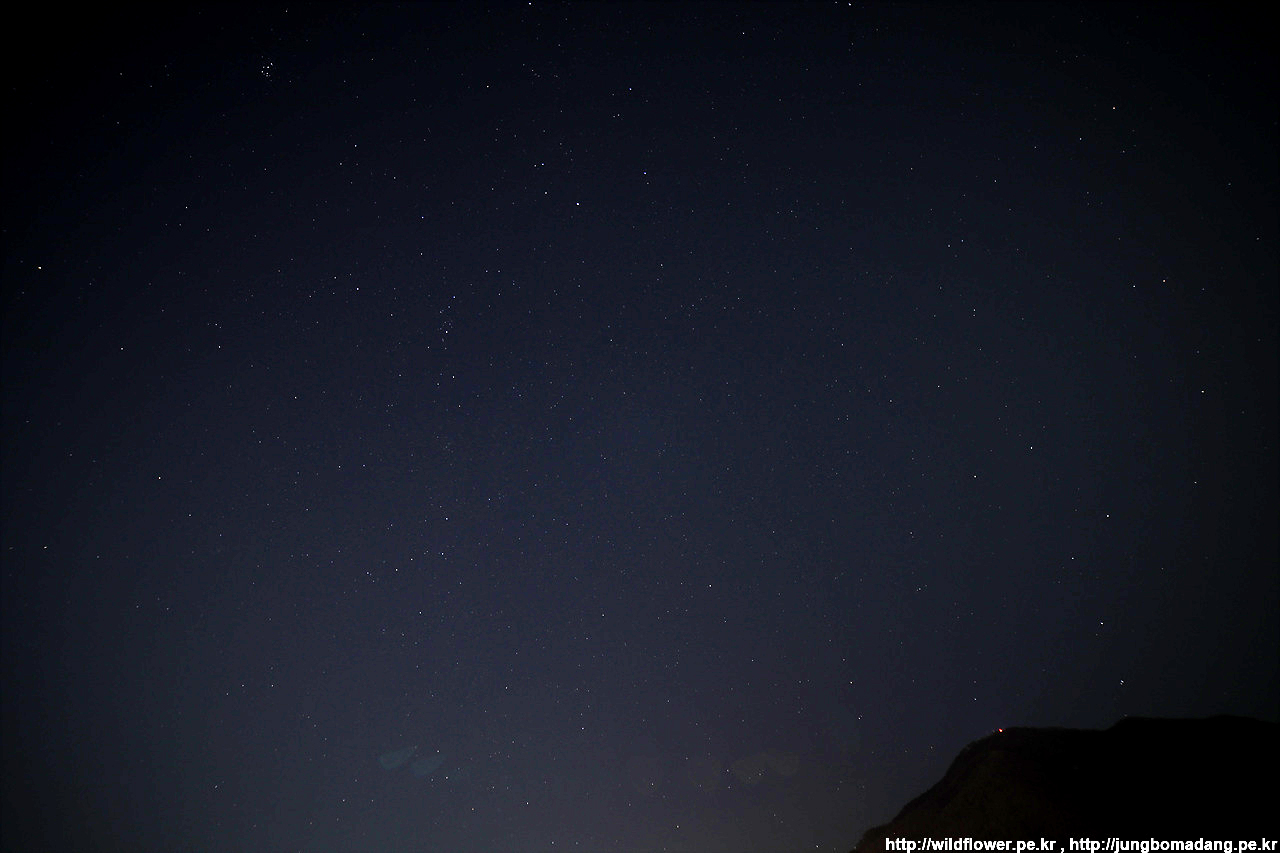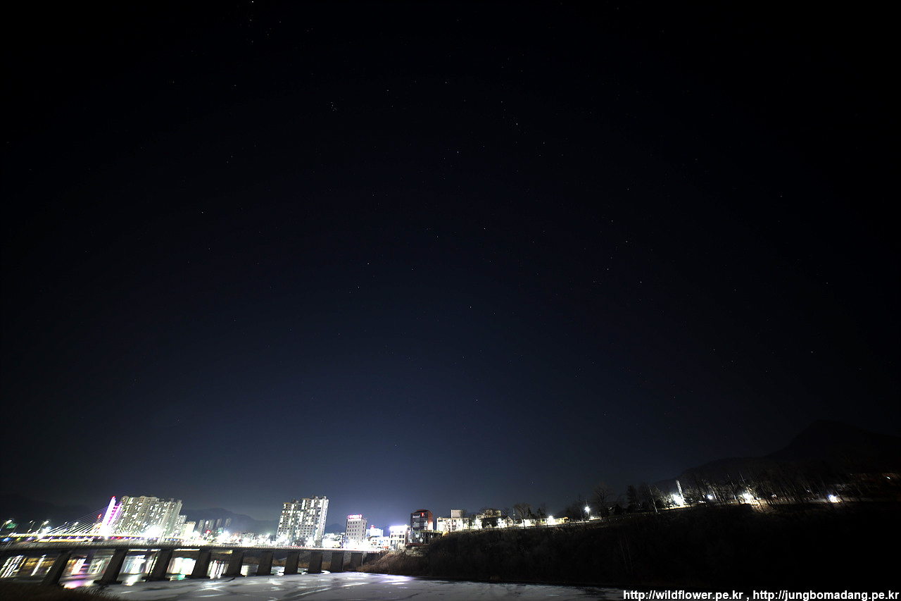 이별이 생각보다는 많이 안보이는 데, 그도 그럴 것이 음력 보름이 지난 지 며칠 안 되었고, 현재 위치한 곳이 동강이 흐르는 인접 도로여서 가로등도 많고 빛 간섭이 많은 이유입니다. 시간상 봉래산 위로 오를 수 없어 급하게 자리를 잡다 보니 그렇습니다. 우측 아래 검은 물체에 빨간 빛 있는 것이 별마로천문대가 있는 봉래산 정상입니다.