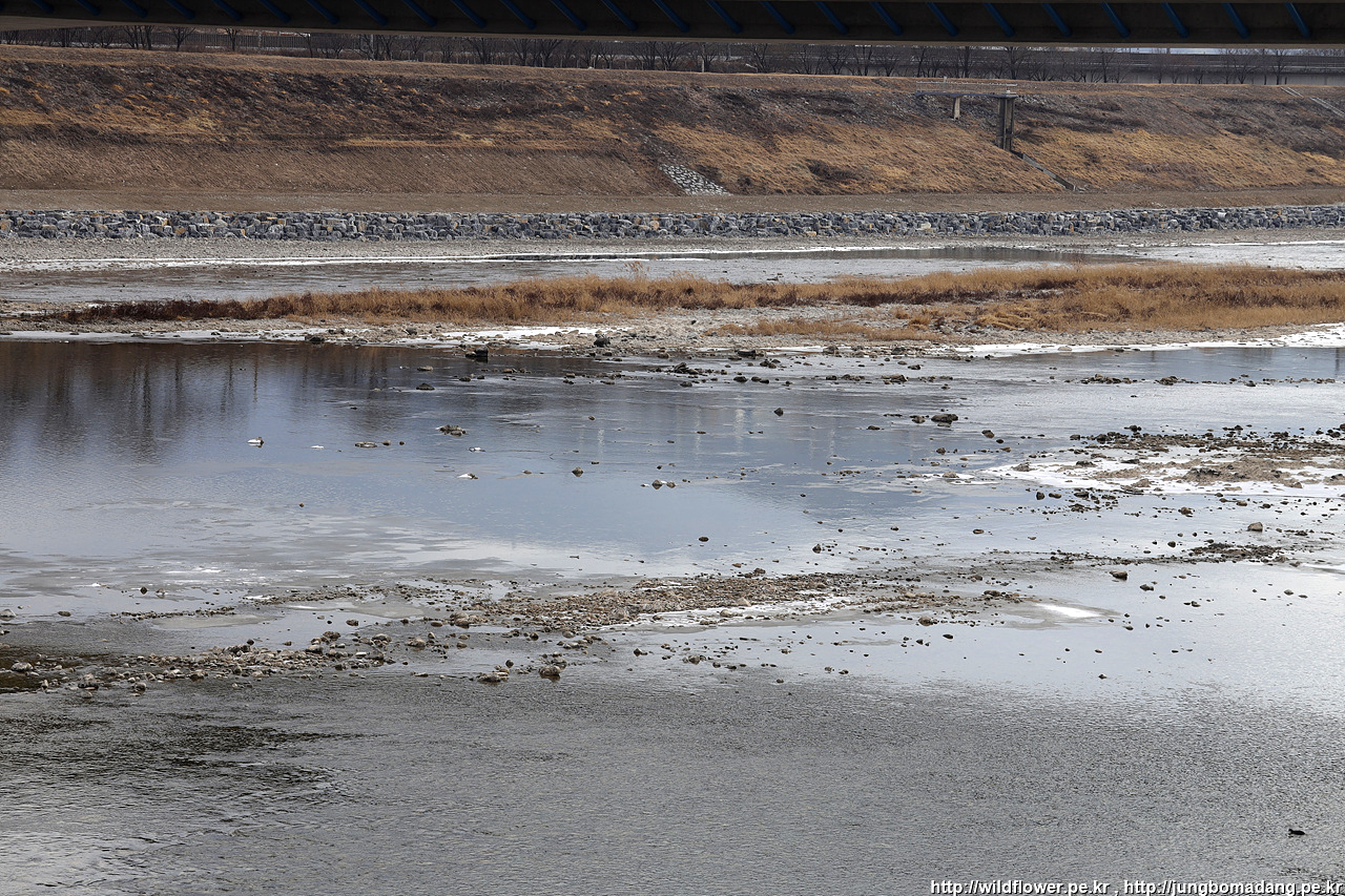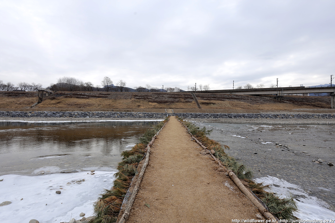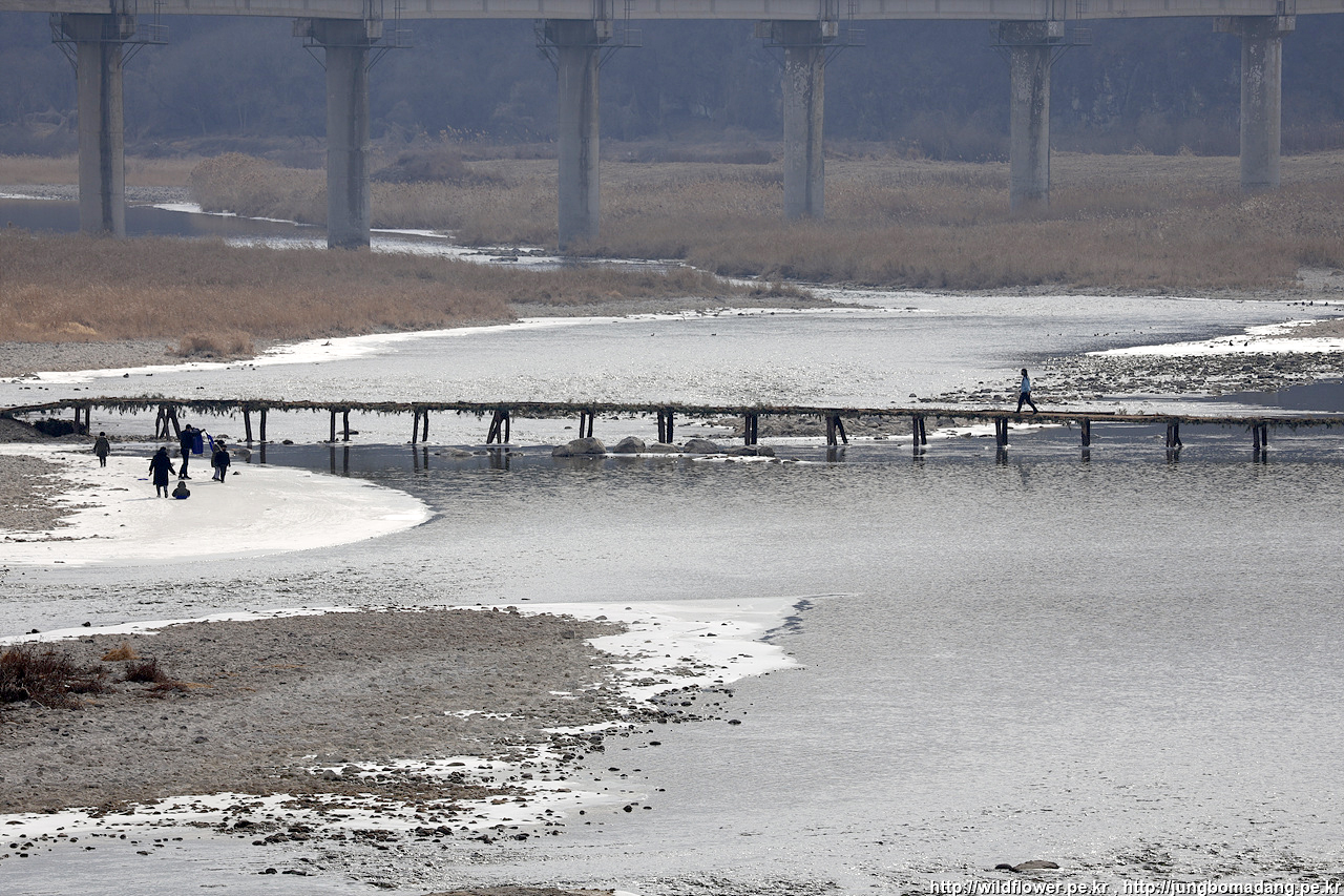 방금 전에 거닐었던 동강섶다리와 썰매 타는 가족