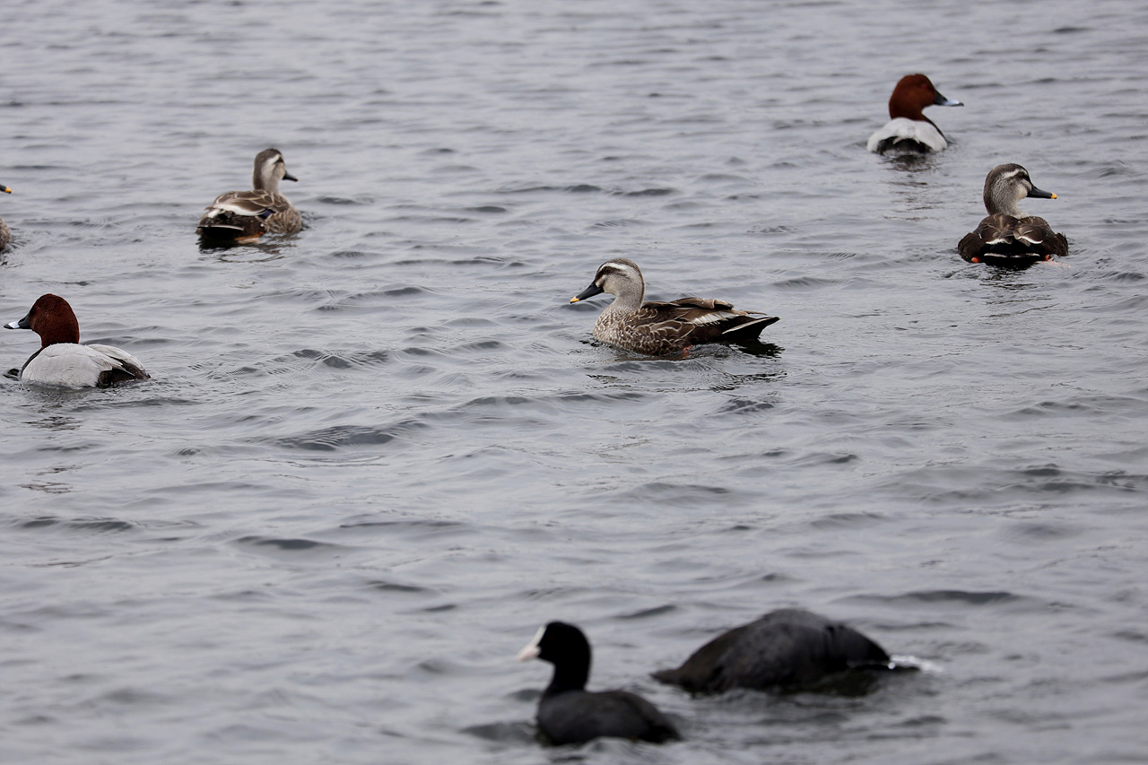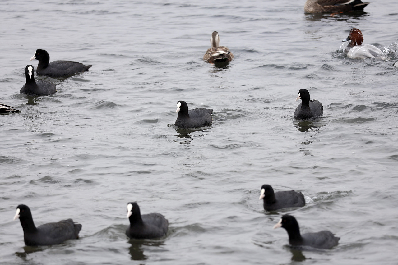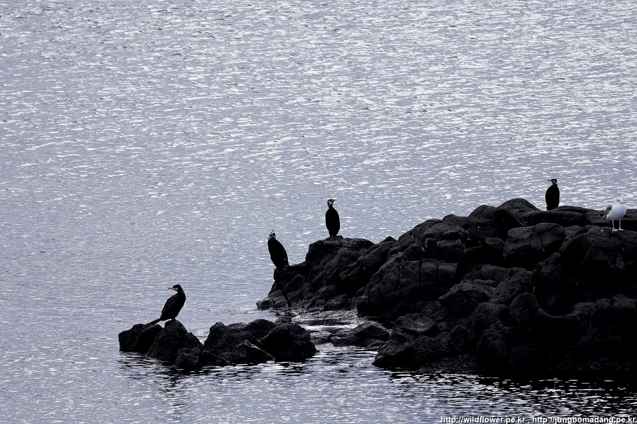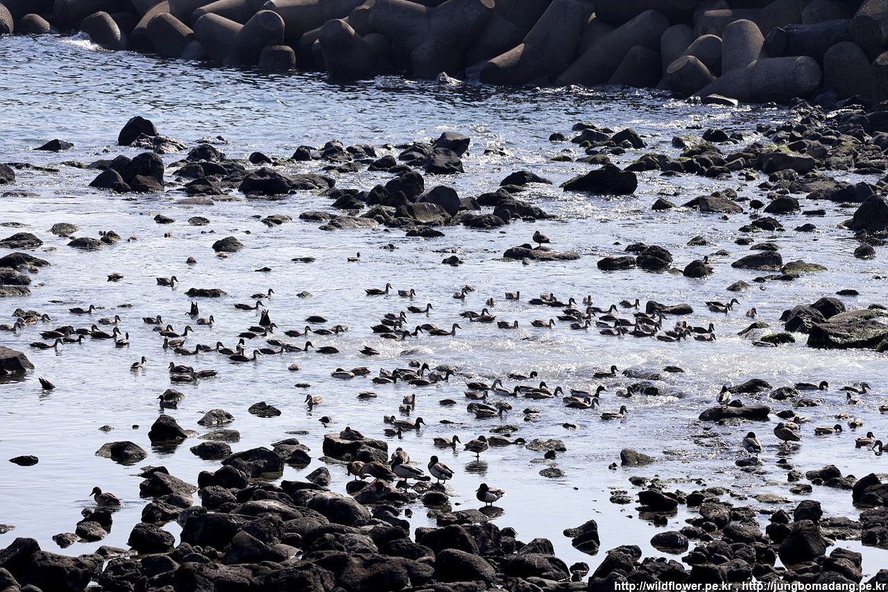 양식장에서 흘러 나온 고물(사료)을 얻어 먹으려고 줄서기 중인 새님들.