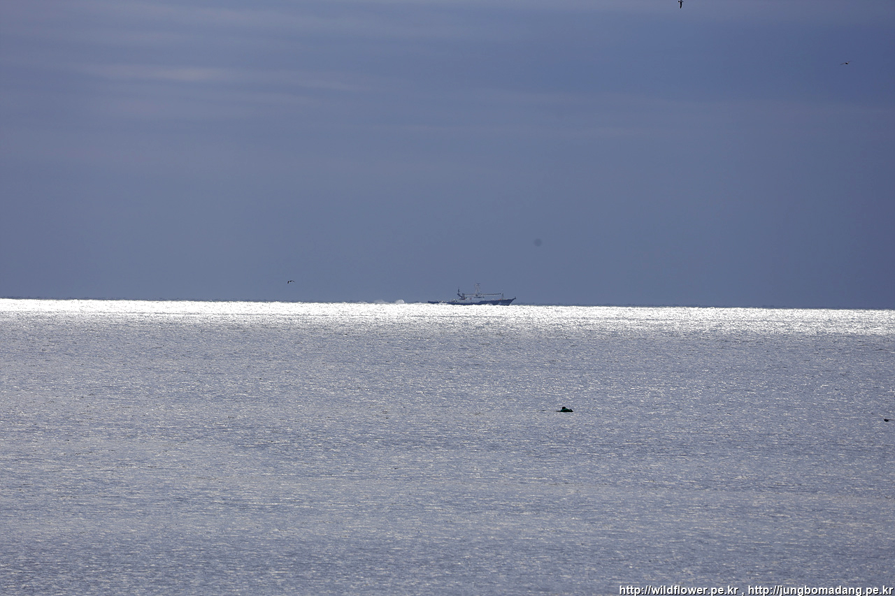 흐린 날씨에 빛내림에 의해 바다의 일부가 은빛으로 반짝입니다.