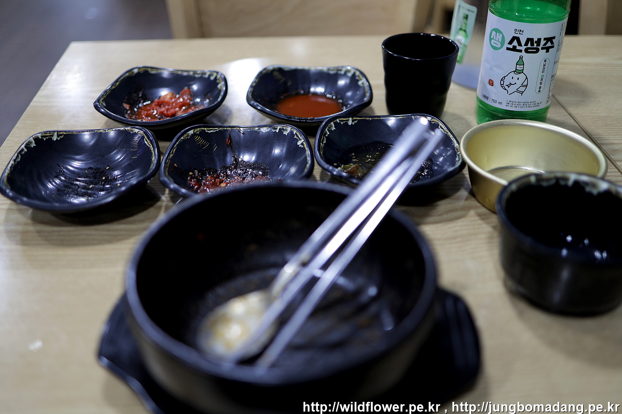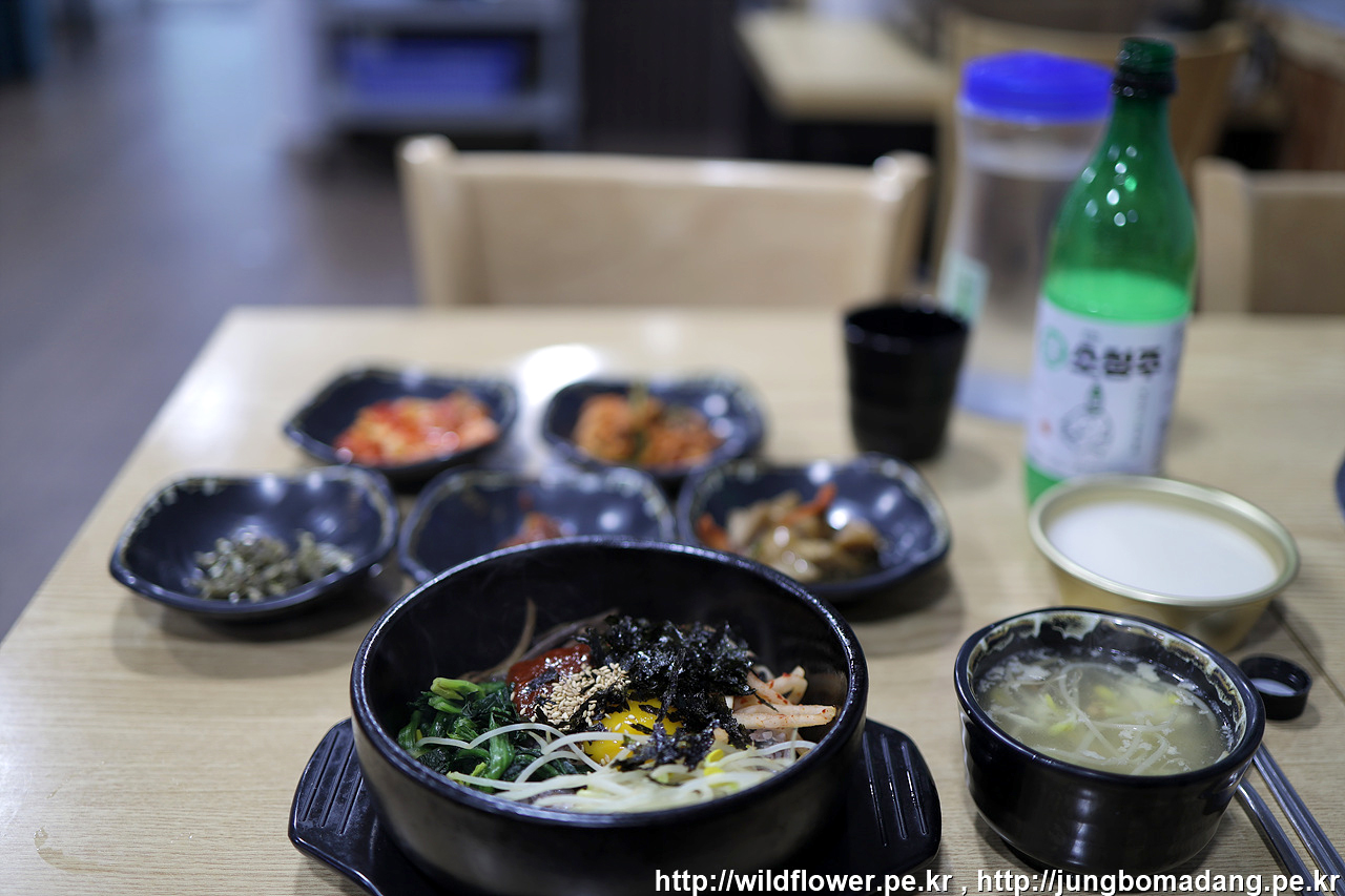 길 건너편 식당 중에 한곳을 선택해서, 돌솥비빔밥, 막걸리(소성주) 이렇게 주문 합니다.