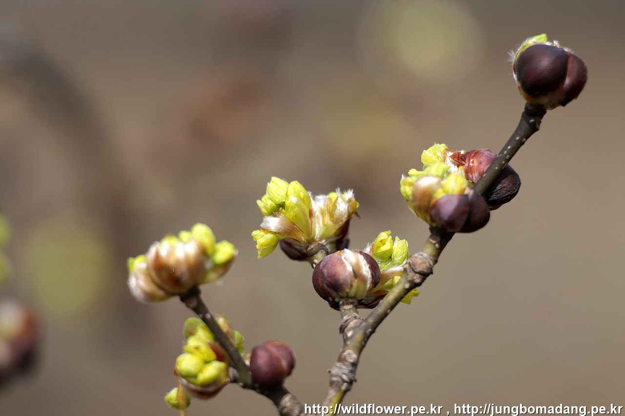 길마가지나무 - 올괴불나무와 비슷하지만, 길마가지나무는 꽃술이 노란색인 것이 특징입니다. 꽃잎은 노란빛 혹은 분홍빛이 섞여 있습니다.