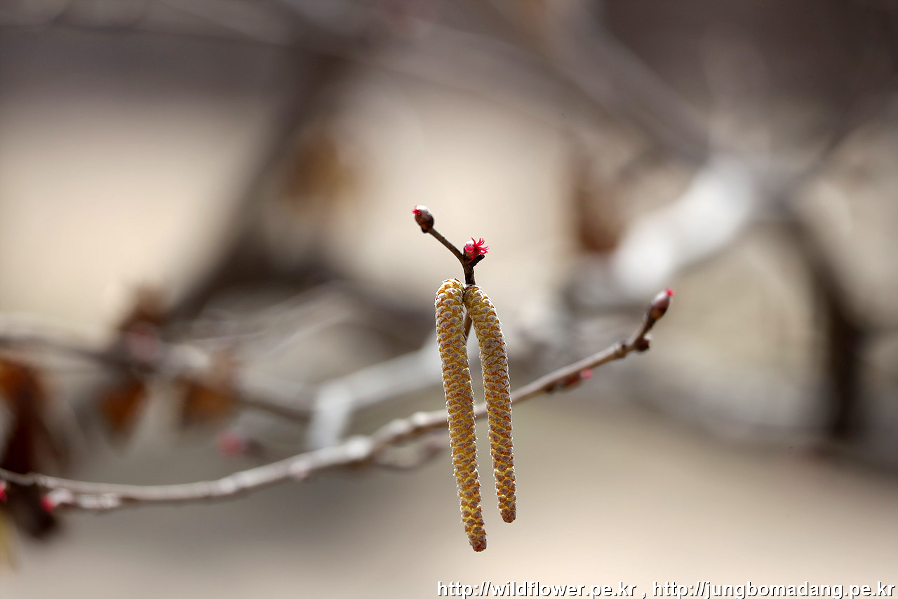 개암나무 - 암꽃(붉은색), 수꽃(노란색)