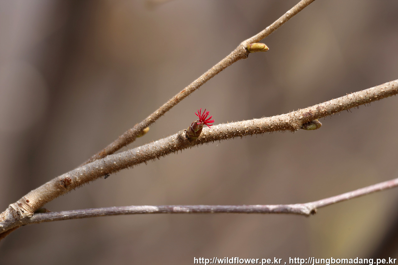 개암나무 - 암꽃, 개암나무는 암수한그루로 수꽃과 암꽃이 나무 하나에 공존하고 수꽃의 꽃가루가 바람에 날려 암꽃에 안착하면 수정이 되는 방식으로 번식을 합니다. 따라서 암꽃에 꽃잎이 없습니다.