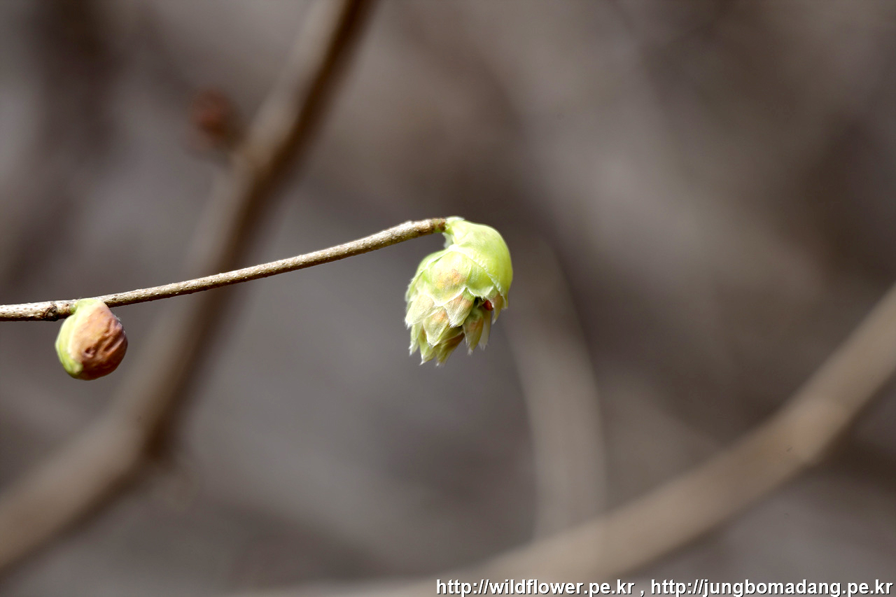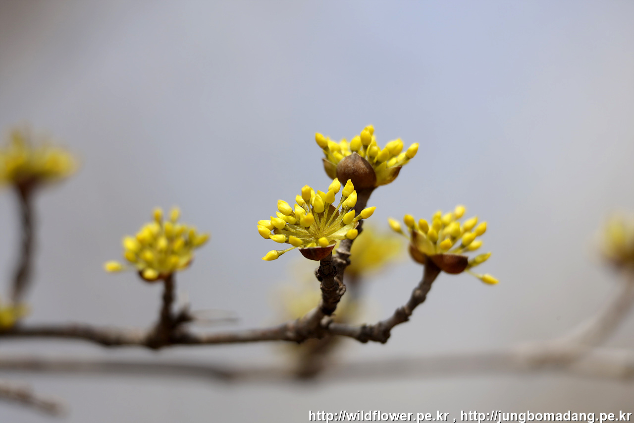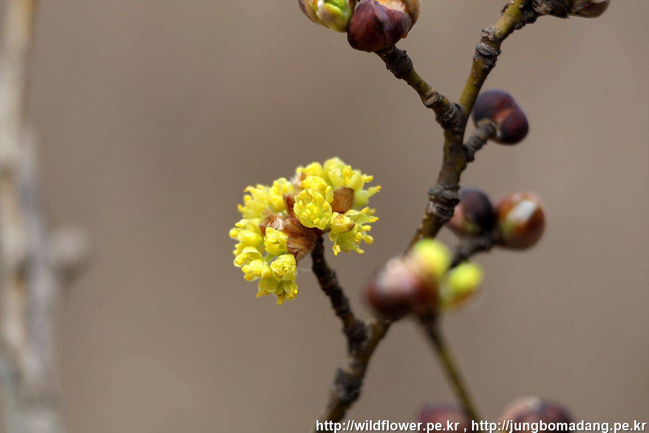 생강나무 - 산수유는 가지 끝에 꽃이 하나씩 열리지만, 생강나무는 꽃이 가지 중간에 붙어서 피거나 뭉쳐서 피는 형태입니다.