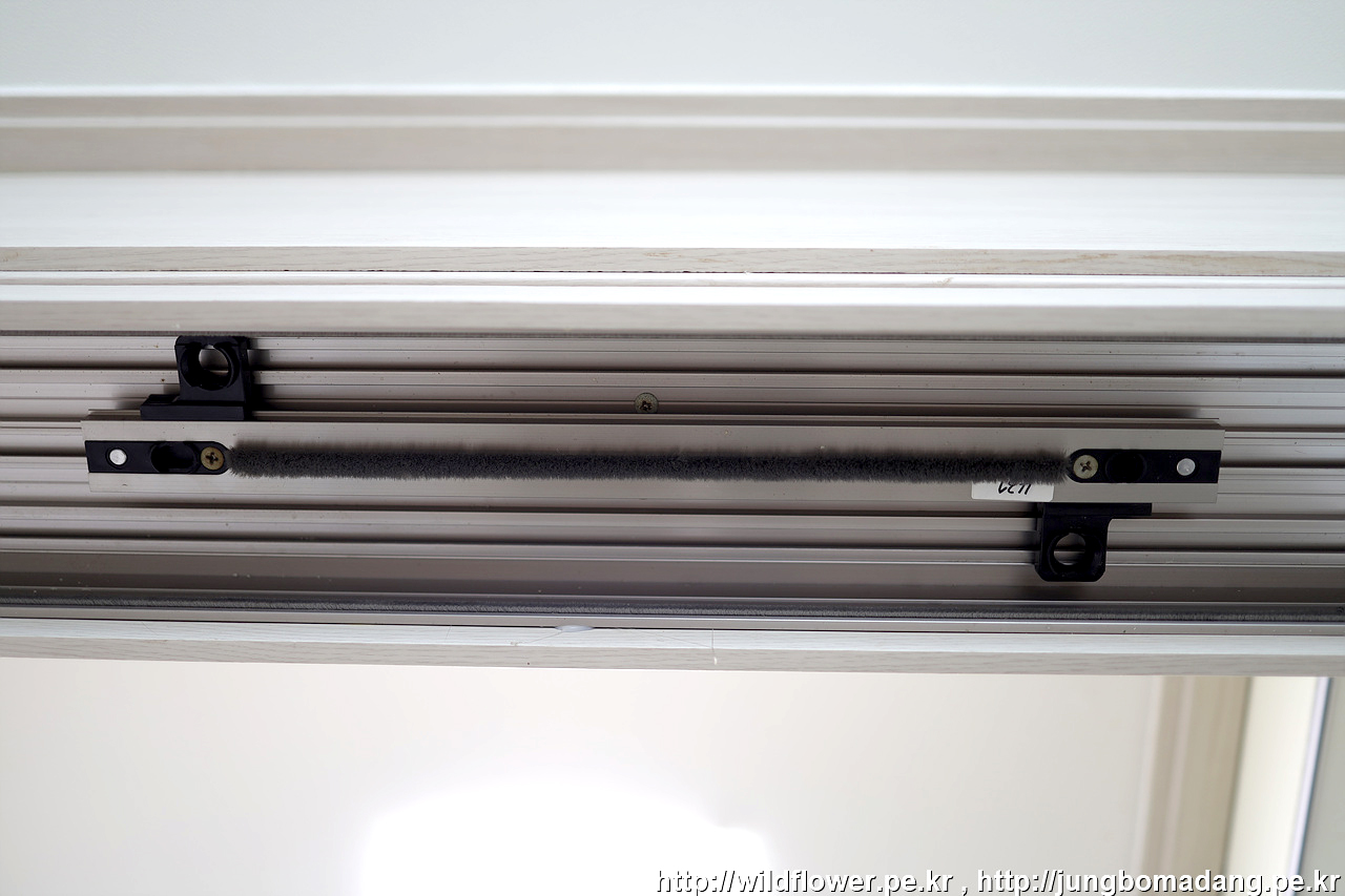 잘못 장착된 경우 이렇게 롤러가 정중앙에 위치하지 않고 한쪽으로 얹혀져서 손잡이문(손)과 중간문(중)의 사이가 더 벌어진 상태 입니다.