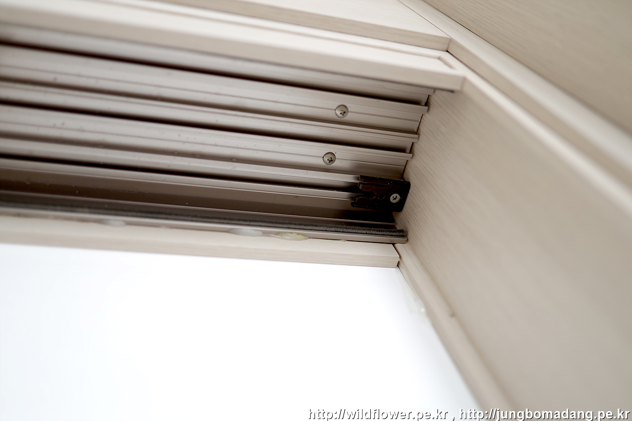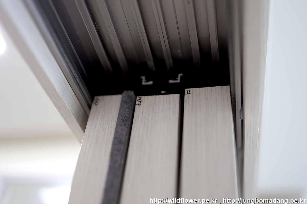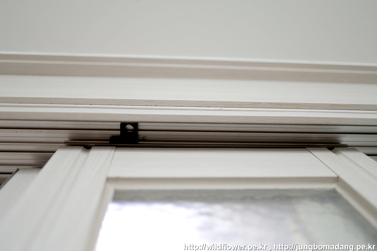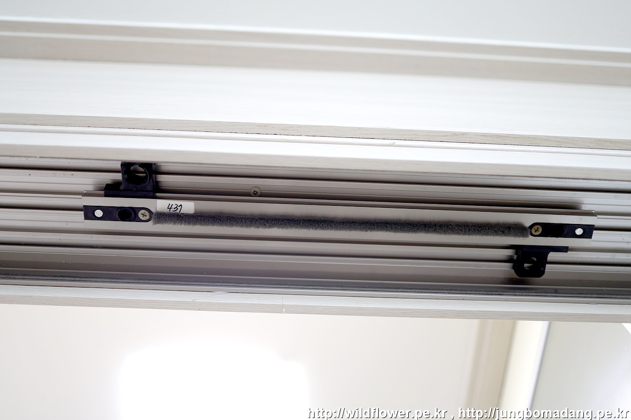 잘못 장착된 경우 이렇게 롤러가 정중앙에 위치하지 않고 한쪽으로 얹혀져서 손잡이문(손)과 중간문(중)의 사이가 더 벌어진 상태 입니다.