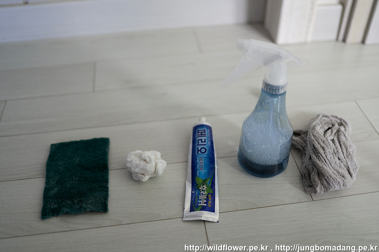 5. 최종 조합입니다. 우선 퐁퐁물을 스티커 자국에 뿌리고, 청수세미에 치약을 뭍혀서 박박 문지르니까 지워집니다. 한번에 안되면 이 과정을 2회 반복하면 됩니다.