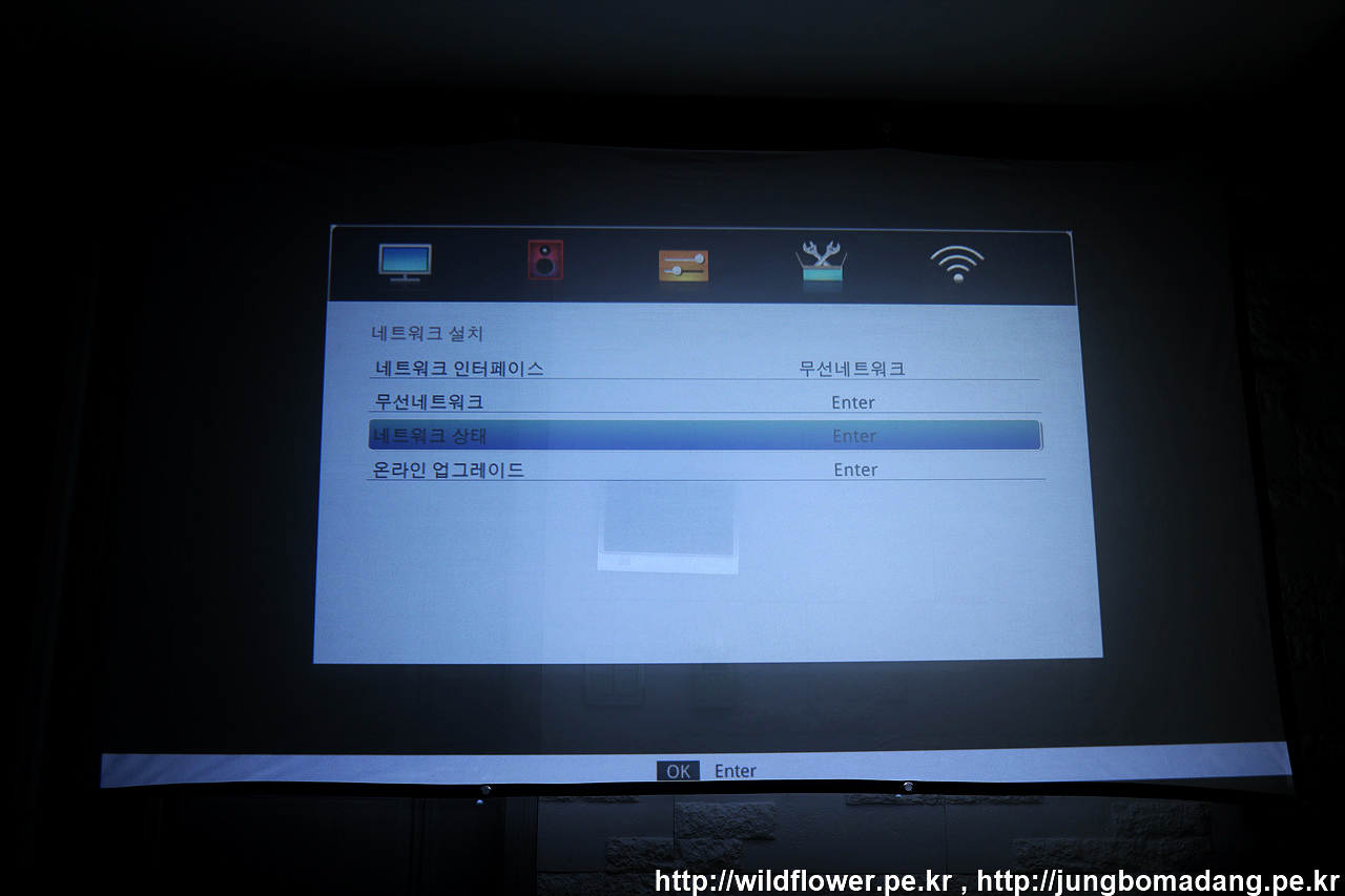 애플 미러링 방식을 통한 무선 연결 시 우선 메뉴 - 네트워크 설치 - 무선네트워크에서 연결하려는 빔 프로젝터와 전송 장치(아이폰, 안드로이드폰)와 같은 네트워크(무선 공유기)에 접속되어야 하는 데, 무선 공유기가 없다면 테더링 기능으로 연결하면 되는 데, 이 때 아이폰이나 안드로이드폰의 네트워크 ID(이름)이 한글이면 안되니 영어로 변경 후 접속하셔야 합니다.