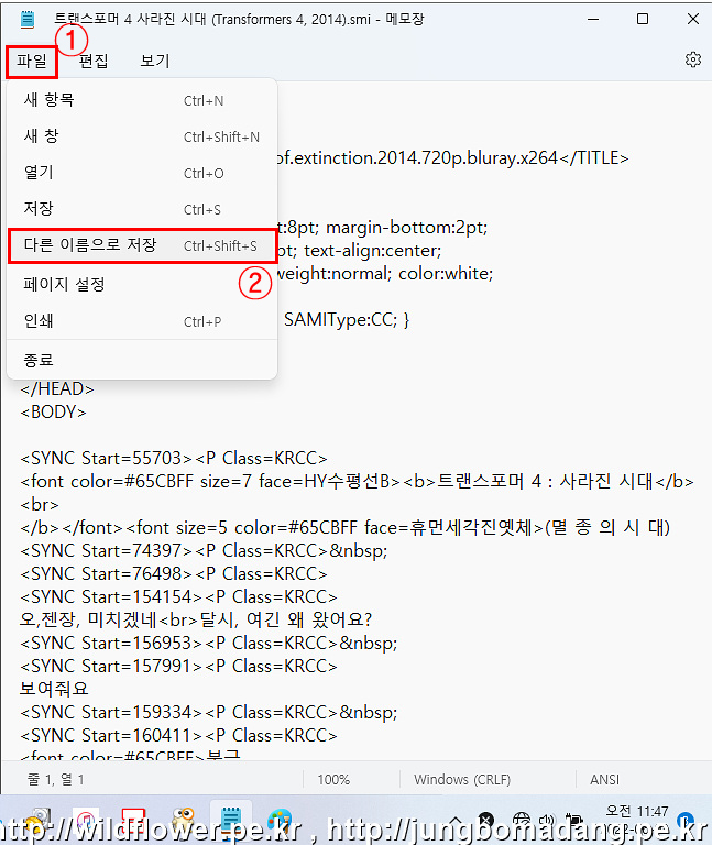 1. 메모장에서 smi 파일을 열고 파일(①) - 다른 이름으로 저장(②)을 클립합니다.