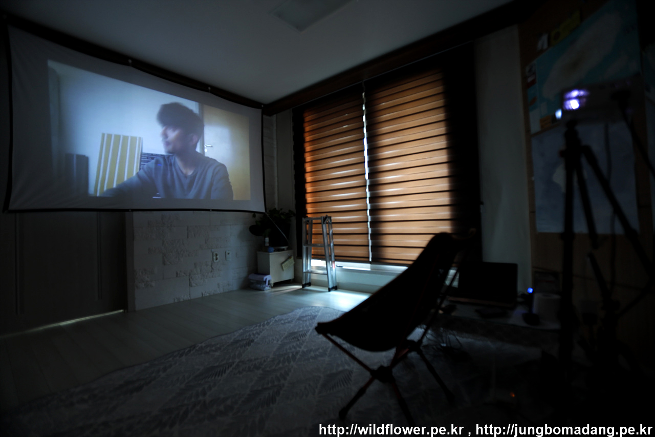 스크린 설치 완료! 100인치이고 16:9 방식이라 세로보다 가로가 깁니다. 원래 안방에 설치하려 했으나, 안방에 설치된 붙박이 장으로 인해.100인치 16:9 스크린과 빔 프로젝터와의 거리가 2.9M~3M가 되지 않아서 부득이 거실에 설치합니다.