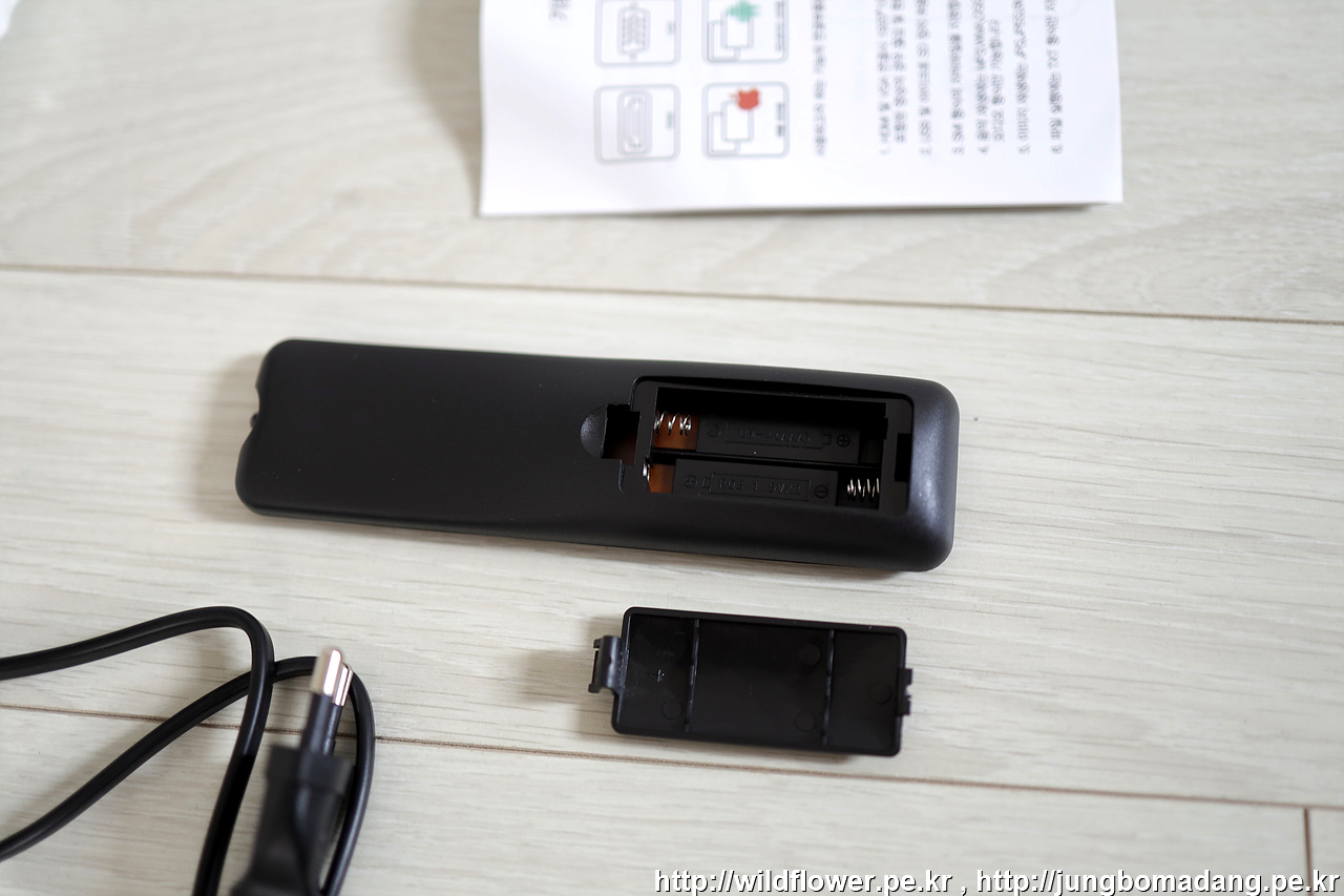 리모컨에 가정집에 누구나 갖고 있는 여분의 AAA 건전지 2개를 + - 맞게 삽입 하구요.