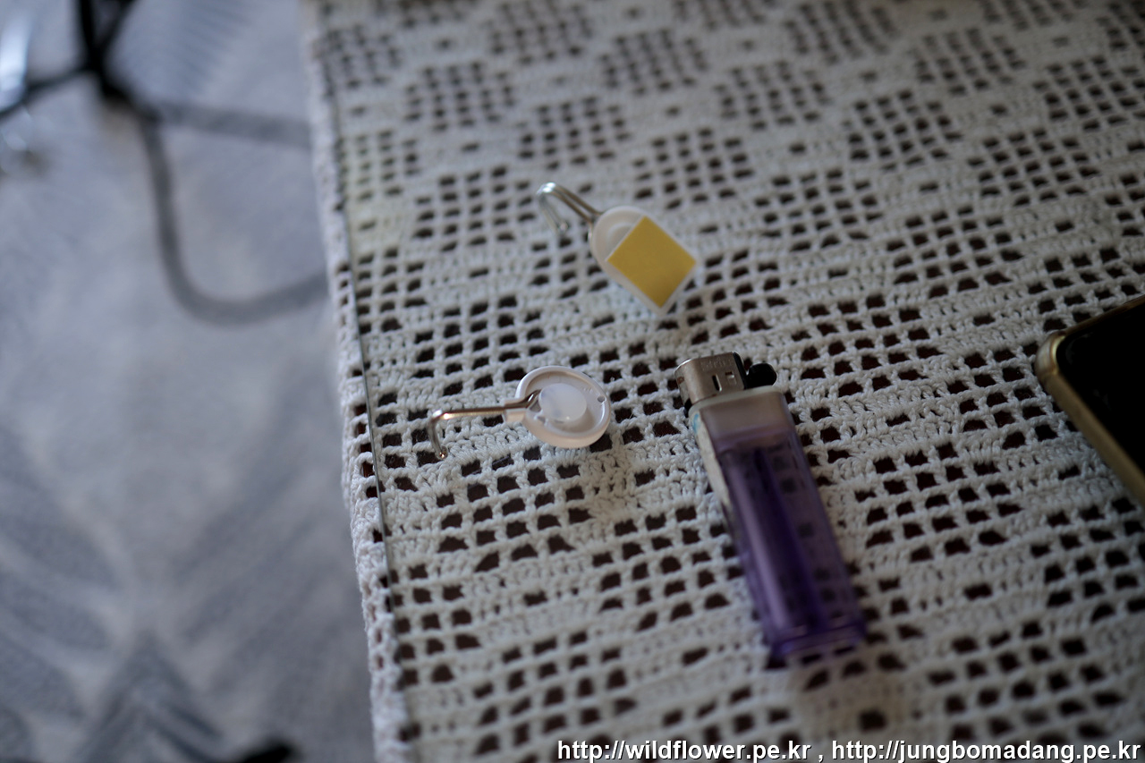 위에 있는 게, 스크린 고정하라고 보내준 양면테이프 방식의 후크고, 아래는 다이소에서 사온 불로 녹여 쓰는 튼튼한 후크입니다.