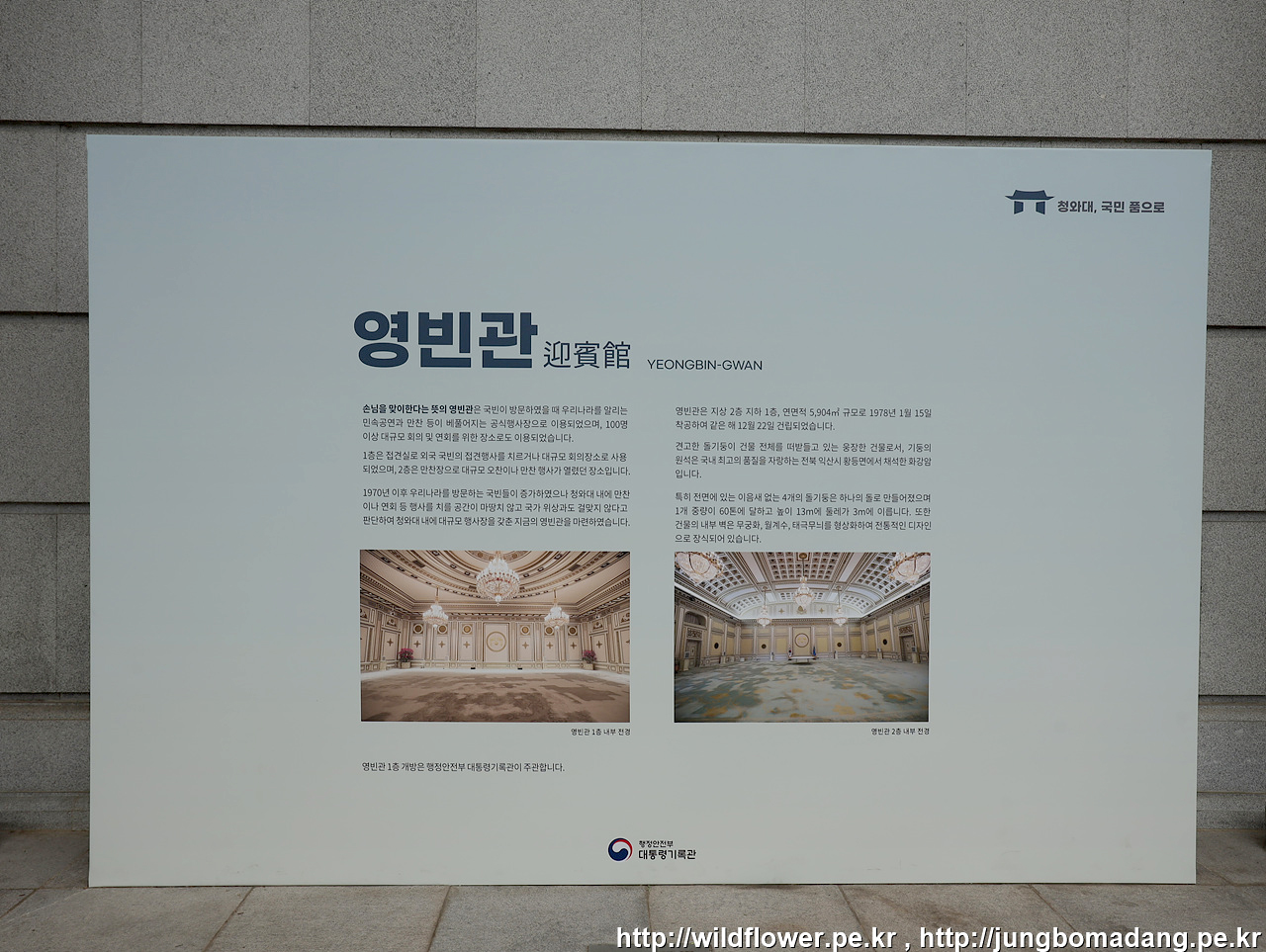 영빈관, 본관은 내부를 관람할 수 있는 데, 영빈관은 파란 덧신을 신고 입장해야 하고, 본관은 검은 덧신을 신고 입장해야 합니다. 관저의 경우 건물 내부까지는 입장이 안되고, 밖에서 둘러보는 형태 입니다.
