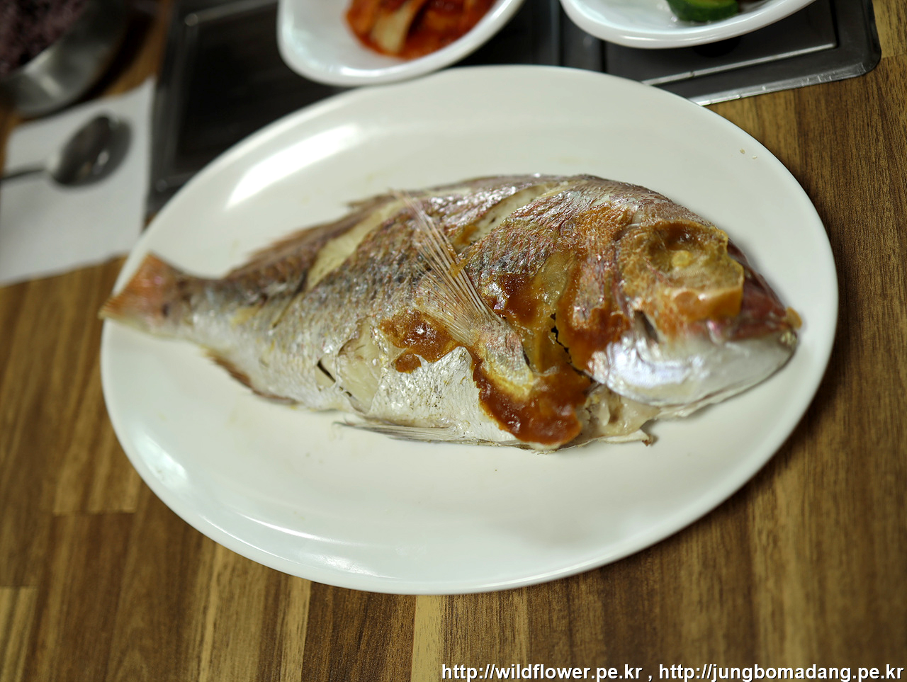 그런데... 다른 테이블의 낚시하시는 분들이 참돔 한마리를 내어 주시어 구이로 조리해 나오네요.
