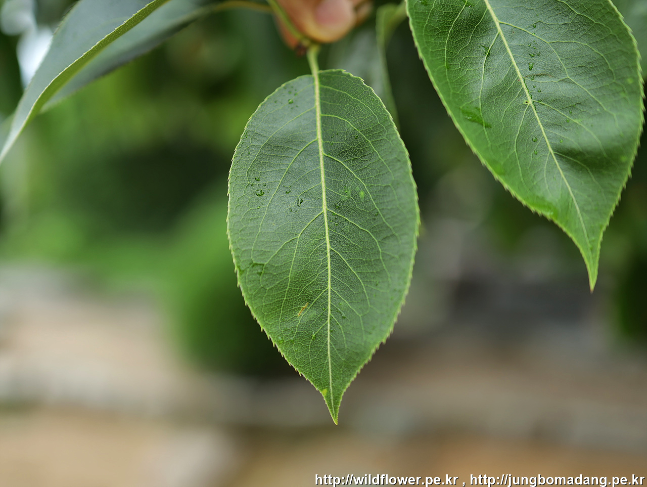 돌배나무 잎 - 콩배나무와 돌배나무가 매우 흡사하여 잎으로 구분하려면 콩배나무는 좌우가 똑같지만, 돌배 잎은 우측편이 좌측편에 비해 끝으로 갈수록 경사가 완만하게 뻗어 있습니다.