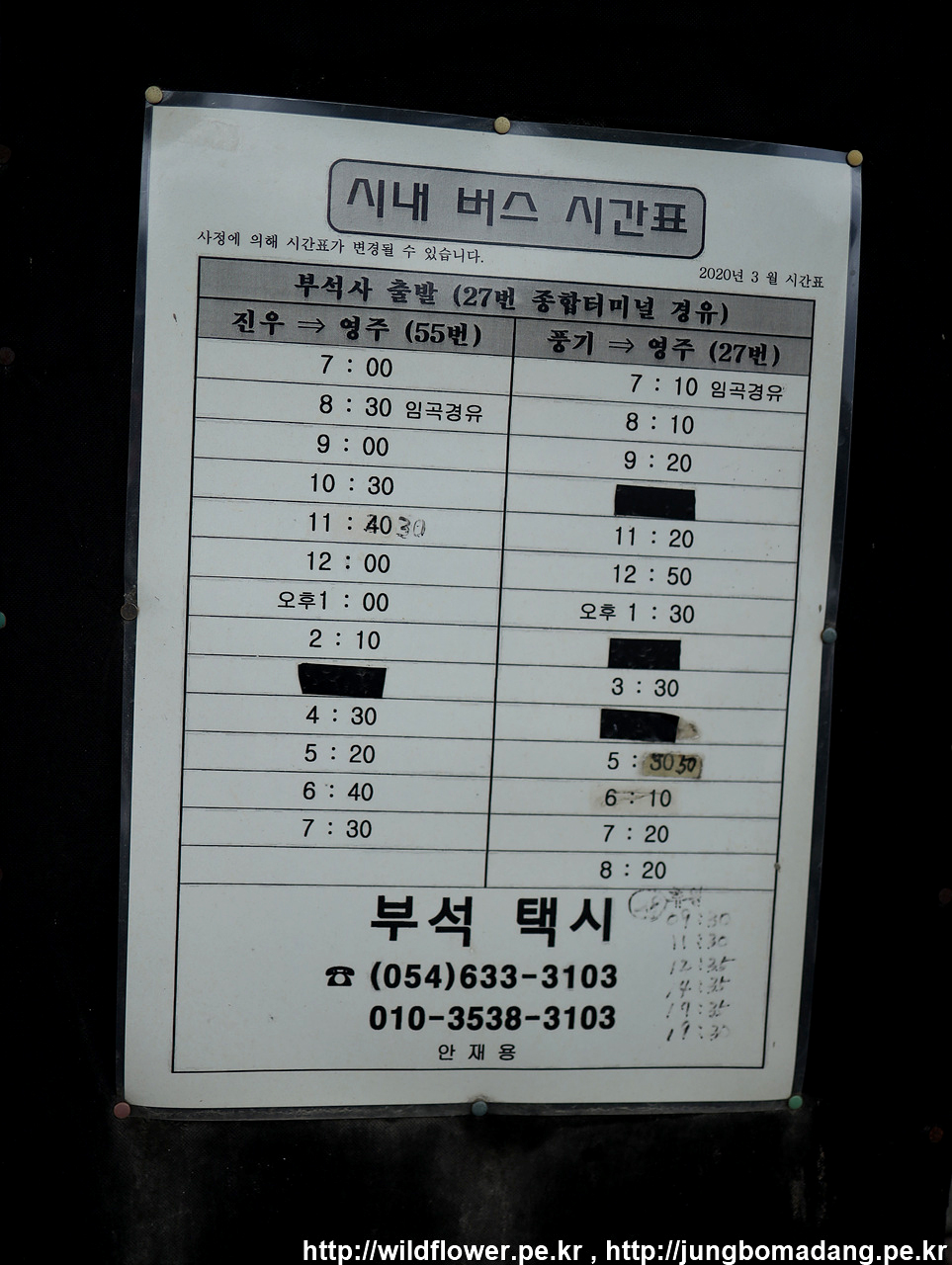 정류장이 아닌 길 건너편 식당 앞에 붙어 있는 버스 시간표. 주말 기준이겠죠? 보다 정확한 시간표는 영주여객(054-633-0011)으로 문의 바랍니다!!