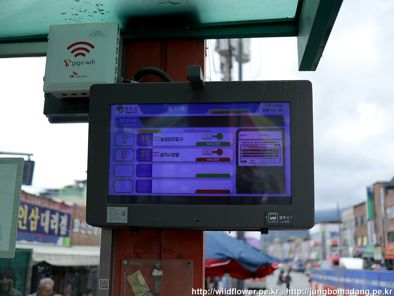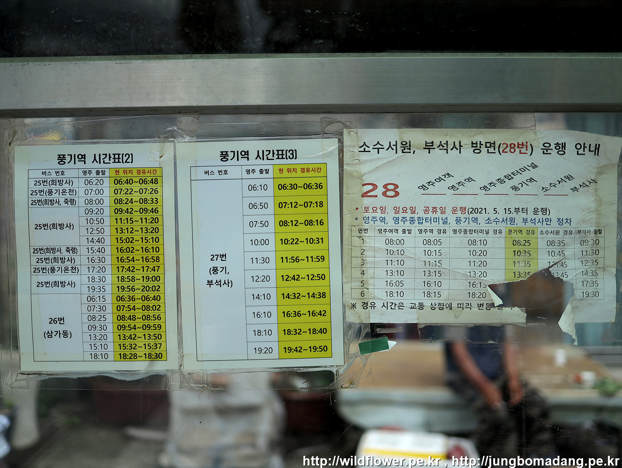 미리 찾아본 풍기역 버스정류장(http://kko.to/I0DDK9SrM)에 부착된 버스 시간표를 살펴보니 27번, 28번 버스를 이용해서 풍기역에서 부석사로 갈 수 있는 것 같은 데, 시간표가 찢어지기도 해서 확인차원에 영주여객(054-633-0011) 연락해서 문의하니 27번은 평일이나 공휴일(주말) 모두 운행하지만, 28번은 공휴일(주말)에만 운행한다고 했으며, 시간표가 변경될 수 있으니 영주여객(054-633-0011)으로 연락하여 시간표를 문의하는 것이 가장 정확하다고 하였습니다. 공휴일(주말)에도 연락 받을 수 있다고 합니다. 그렇게 현재 시간 기준 27번 버스가 10시에 영주에서 출발하여 20여분 후에 풍기역을 지난다는 것을 확인 후 식사를 하기 위해 주변을 잠시 둘러 봅니다.