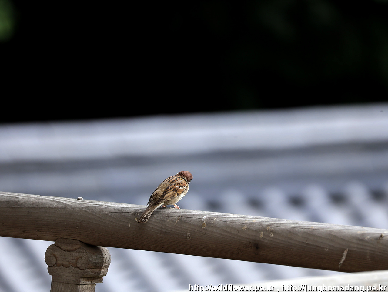 안양루에 참새 한마리가 앉아 쉬고 있습니다.