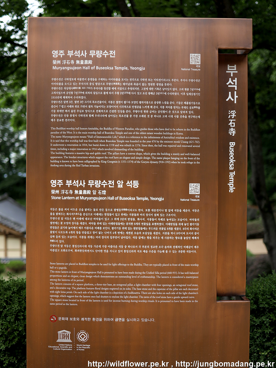 부석사 무량수전 - 국보 18호로 지정된 경북 안동의 봉정사 극락전과 함께 한국에서 가장 오래된 목조 건축물입니다. 잠시 후에 앞쪽에서도 살펴 보겠습니다.