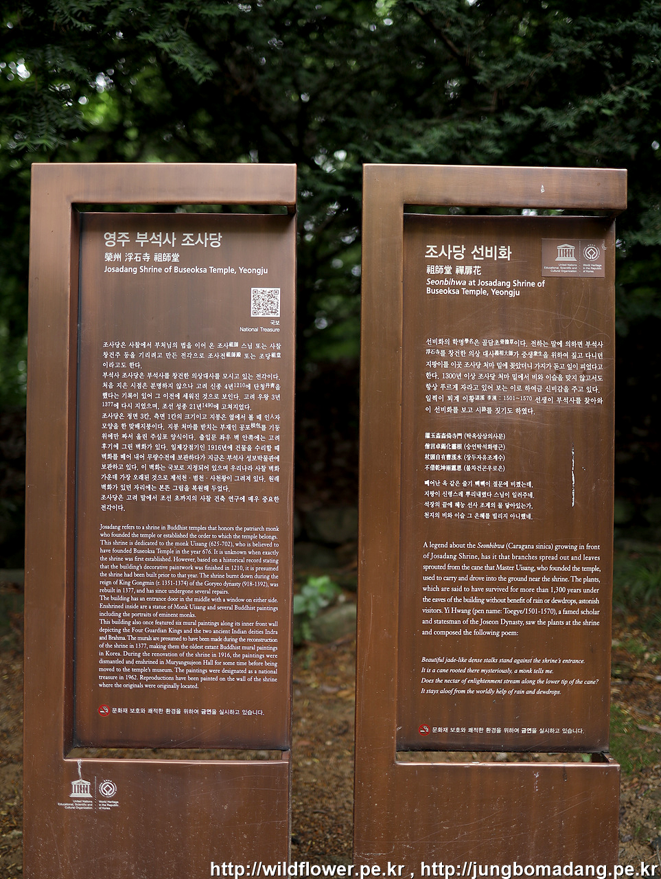 부석사 조사당 - 부석사를 창건한 의상대사를 모신 전각으로 선비화는 의상대사가 중생을 위해 짚고 다니던 지팡이를 꽂아 두었더니 가지가 돋고 꽃이 피었다는 전설의 나무이며, 종류는 골담초입니다.