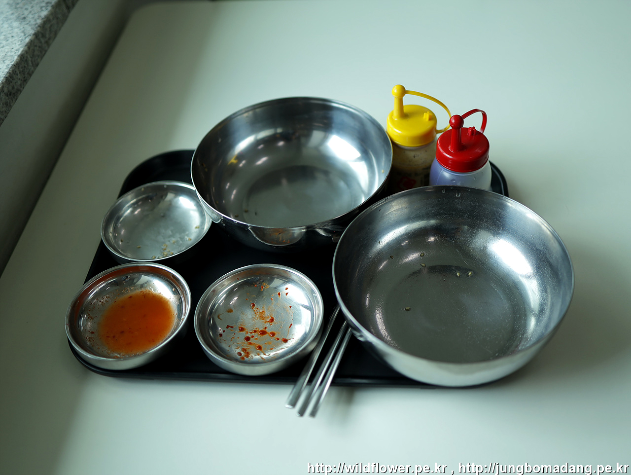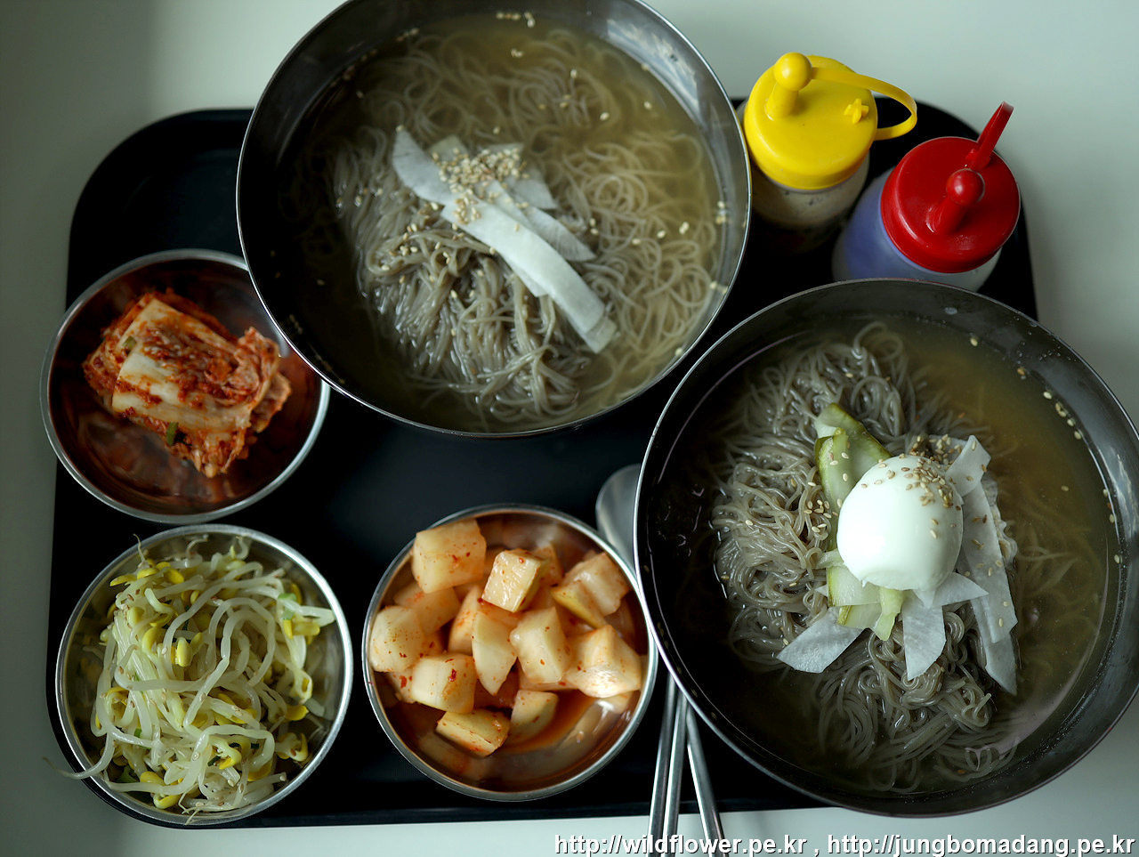 좌측 아래 계란이 얹혀진 것이 물냉면 곱배기 중간 위에 있는 것이 사리 있데, 둘다 큰 차이를 모르겠네요. 고로 두그릇인셈 ㅋㅋ