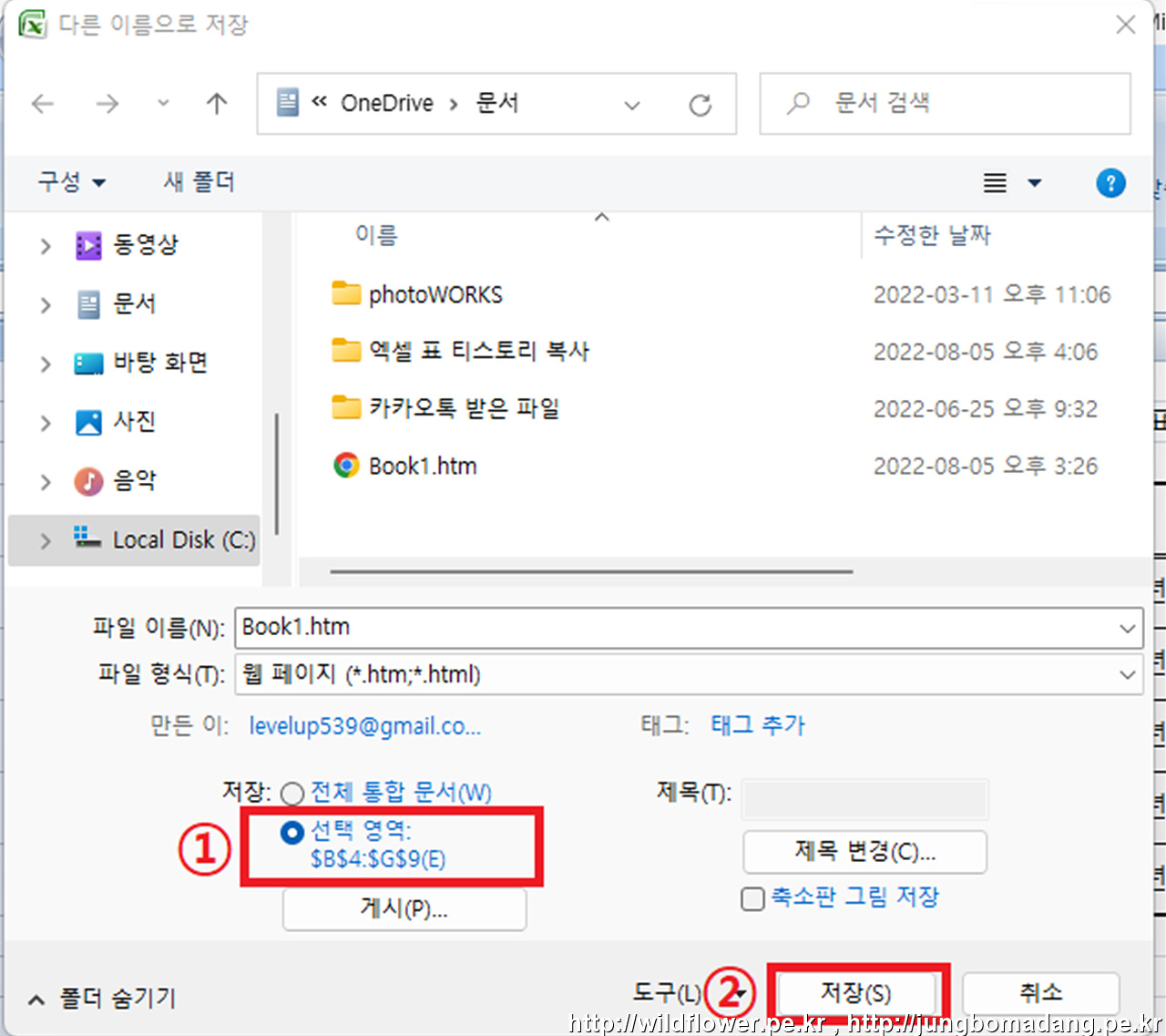 4. [저장:]이 [전체 통합 문서]로 되어 있는 부분을 [선택 영역:]을 클릭(①)하여 선택 변경 후 [저장](②)을 클릭 합니다.