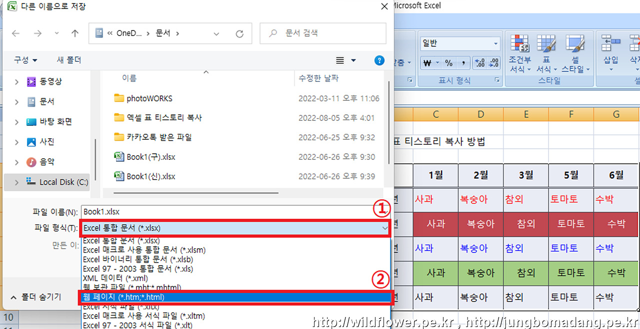 2. [다른 이름으로 저장] 창에서 파일 형식의 [Excel 통합 문서](①)를 클릭해서, [웹 페이지 (*.htm,*html)](②)으로 클릭 변경합니다.