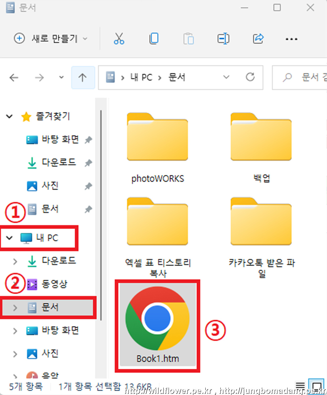 6. 윈도우 탐색기를 열어서(윈도우키 + E키), [내 PC](①) - [문서](②) - [Book1.htm](③) 파일을 더블 클릭하여 엽니다. 제가 사용중인 htm 파일의 기본 프로그램은 크롬이지만 엣지를 사용하시는 분도 상관 없습니다. 엣지의 경우 아래 7. 번에서 메뉴 이름이 약간 다르니 주의 깊게 봐 주세요.
