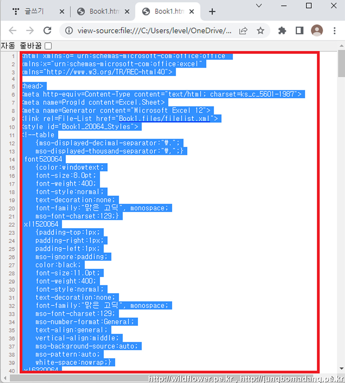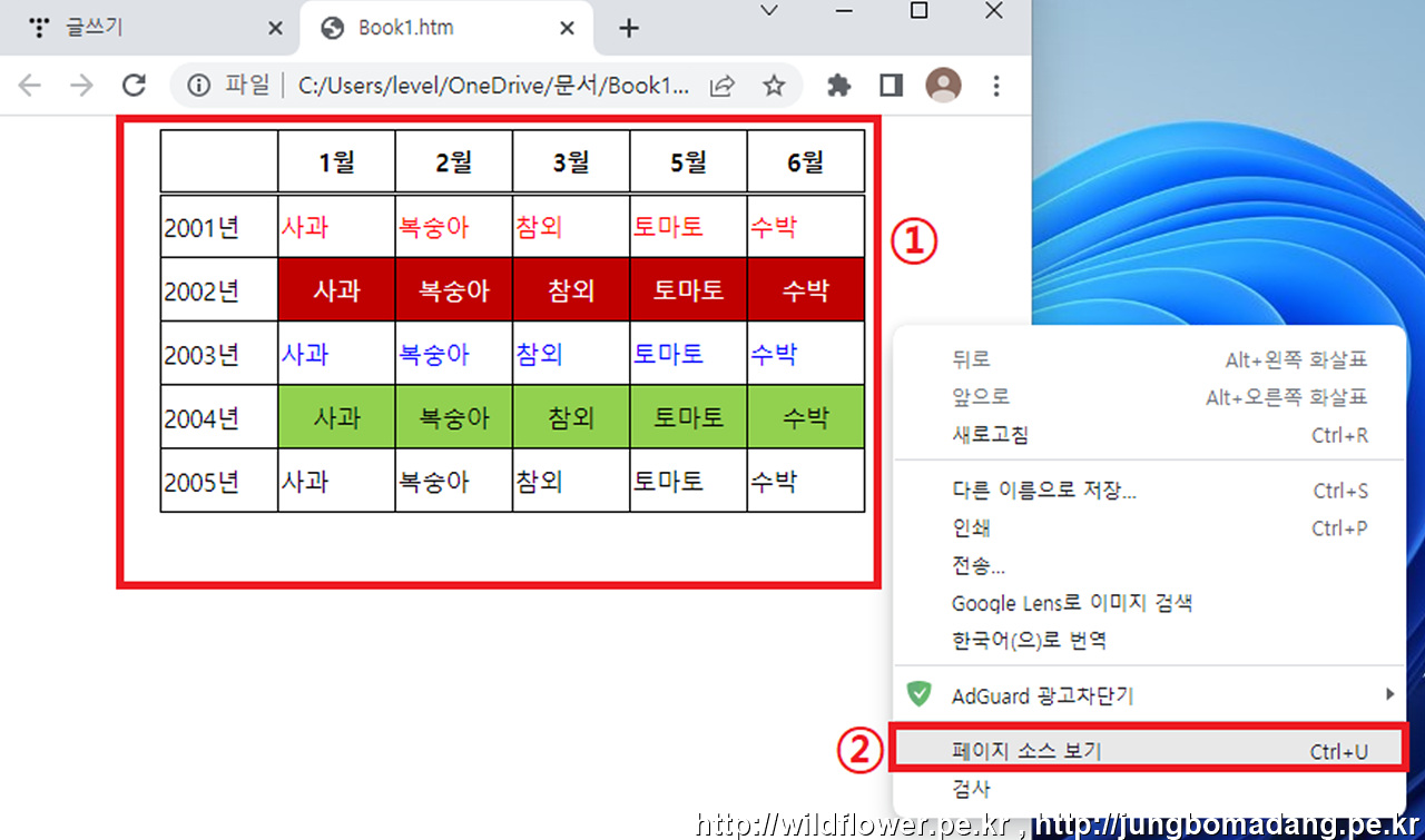 7. 표가 저장된 Book1.htm이 크롬(또는 엣지)으로 표시가 되었습니다. 색상이라든가 형식이 그대로 유지중인 것을 확인하실 수 있습니다(①). 표가 있는 곳에서 마우스 오른쪽 버튼을 누르면 메뉴가 보이는 데, [페이지 소스 보기](②)를 클릭합니다. 만일 엣지로 보고 계신다면 [페이지 원본 보기]를 클릭합니다.