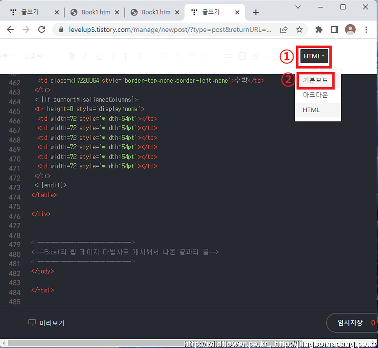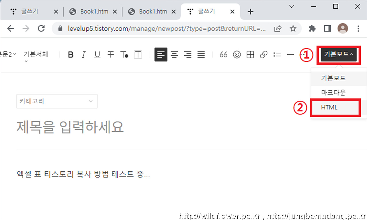 9. 티스토리 글쓰기 화면에서 우측 상단에 [기본모드](①)로 되어 있는 부분을 클릭 후 [HTML](②)로 클릭 변경합니다.