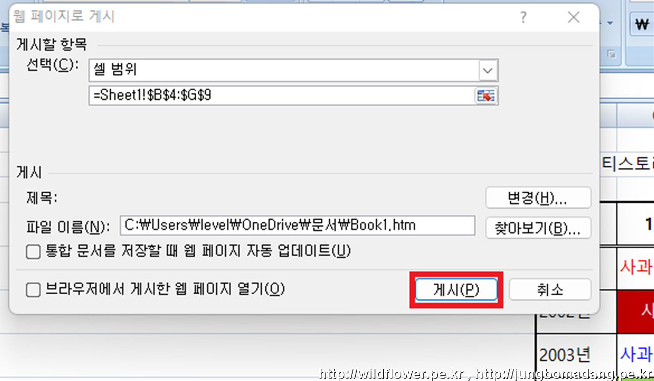5. [게시]를 클릭합니다. 이렇게 하면 엑셀 표가 컴퓨터의 문서 폴더에 Book1.htm 파일로 저장이 됩니다.