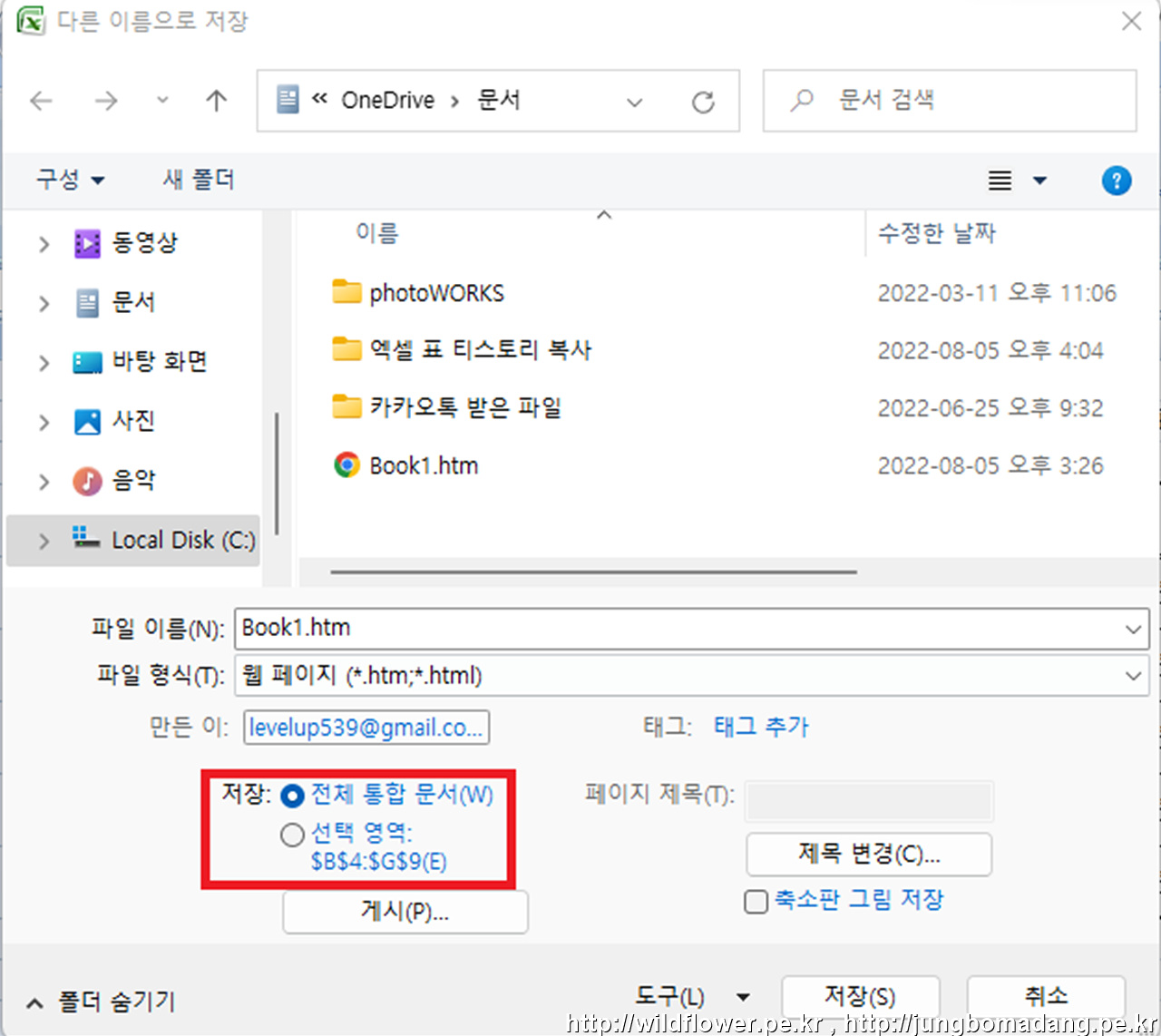 3. [다른 이름으로 저장] 창에서 아래 옵션 중에 [저장:]이 [전체 통합 문서]로 되어 있는 부분에서