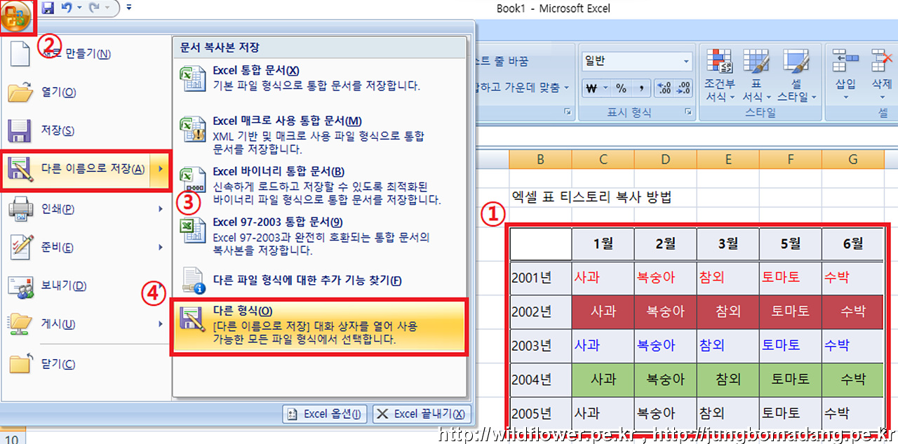 1. 엑셀에서 복사하길 원하는 표를 블럭 지정(①)한 뒤, 엑셀 메뉴(②) - [다른 이름으로 저장](③) - [다른 형식](④)을 클릭합니다.