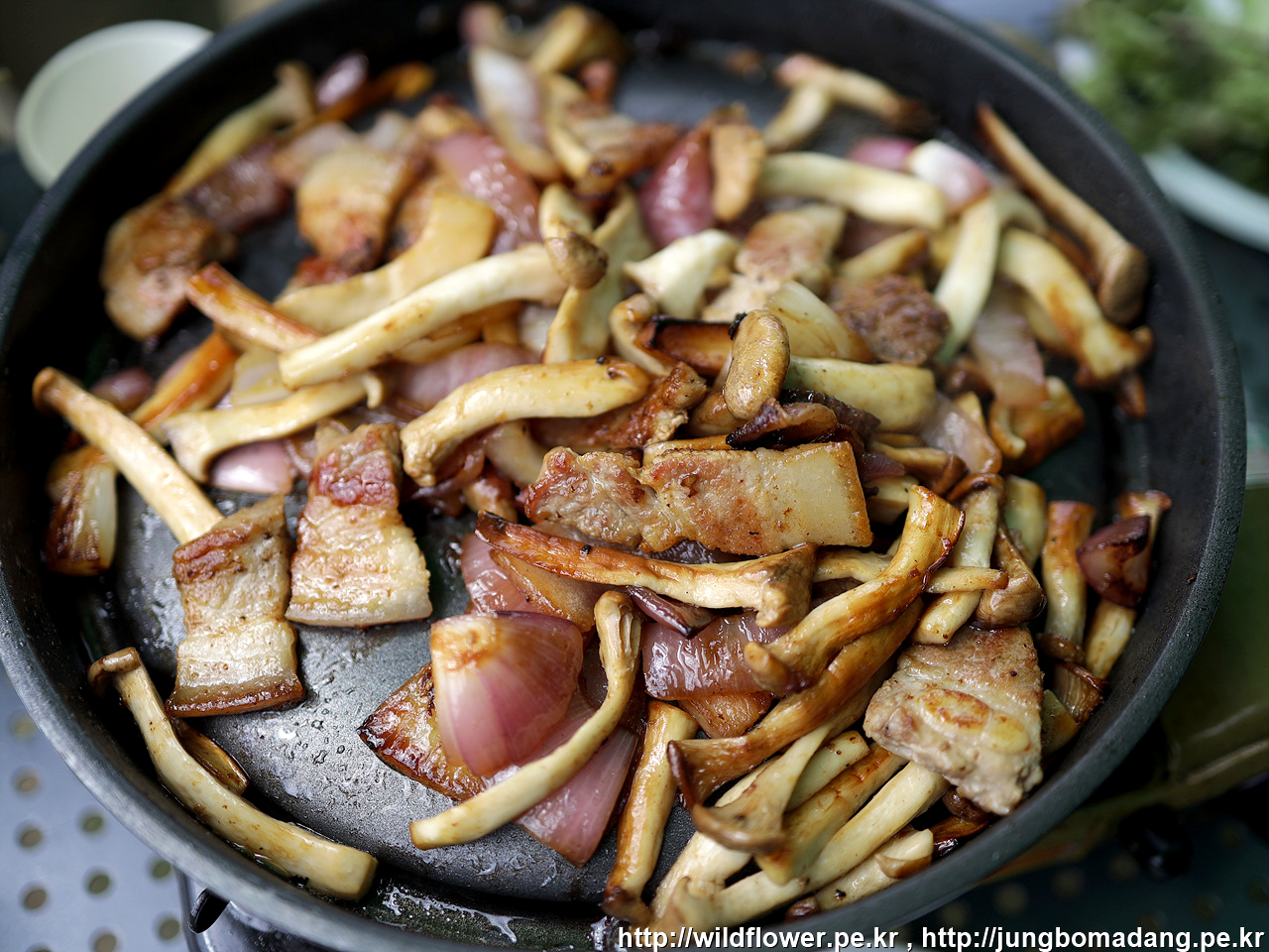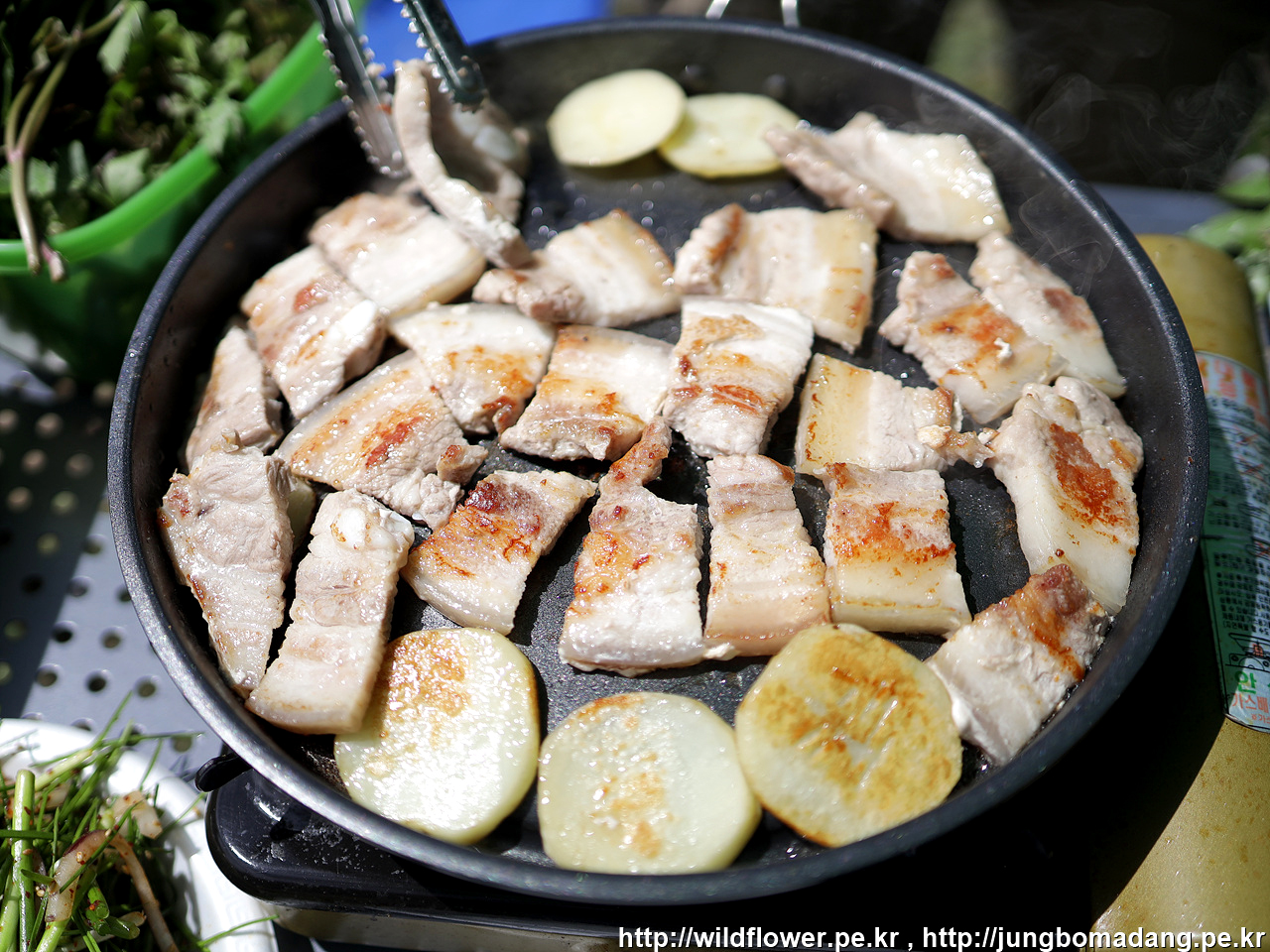 텃밭에서 고추를 따 오는 시간, 삼겹살이 익어 갑니다.
