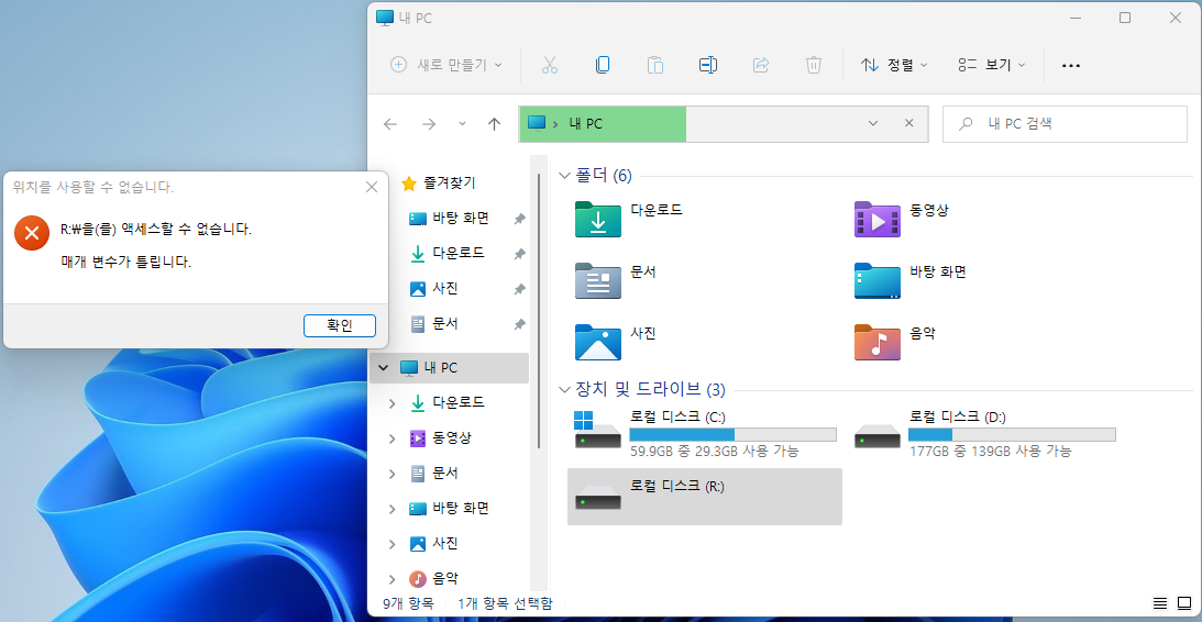노트북을 켜고 작업을 위해 사진이 잔뜩 들어 있는 6TB(테라) HDD를 탐색기로 접근하니 E:W을(를) 액세스할 수 없습니다.