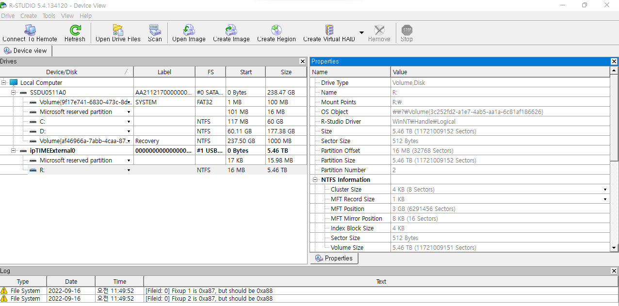 6TB 짜리 하드의 파티션이 NTFS가 아닌 RAW로 변경되어 있습니다.