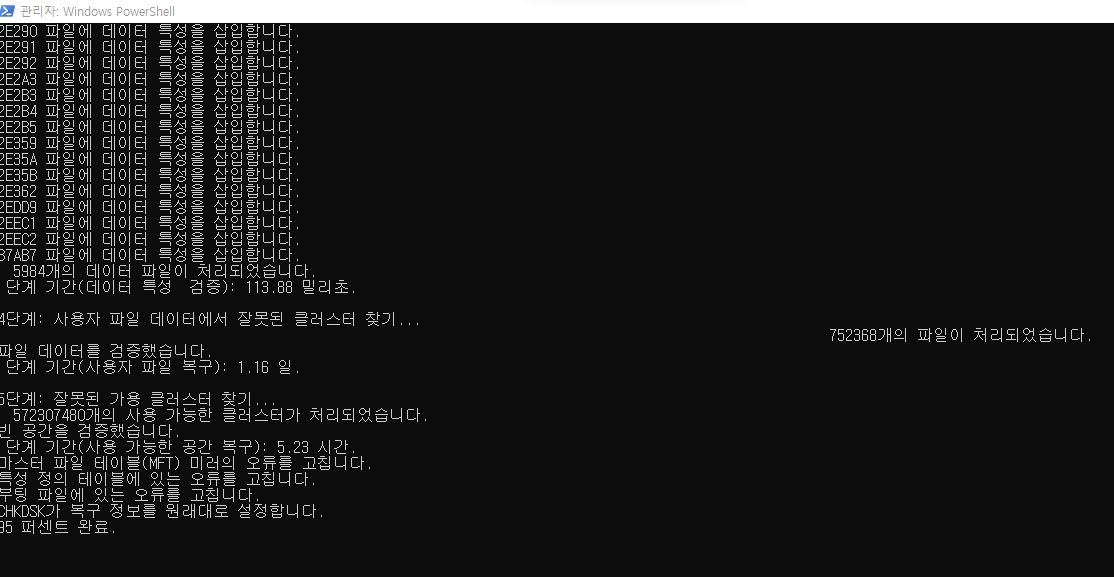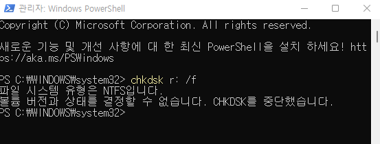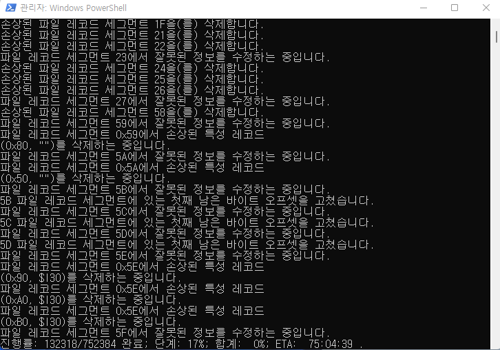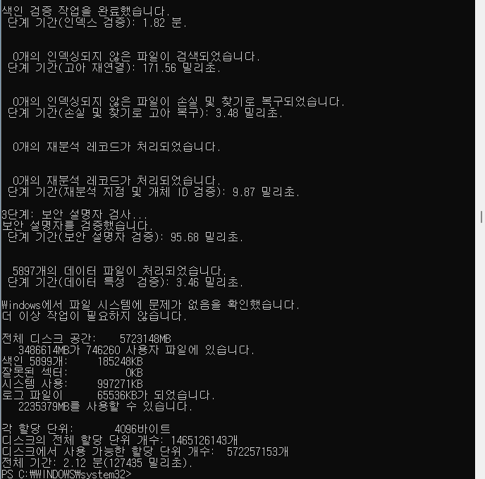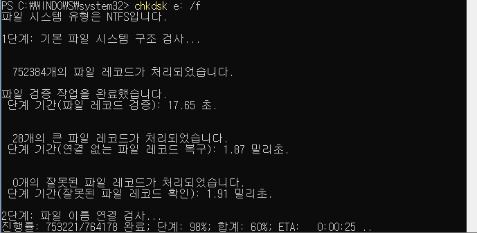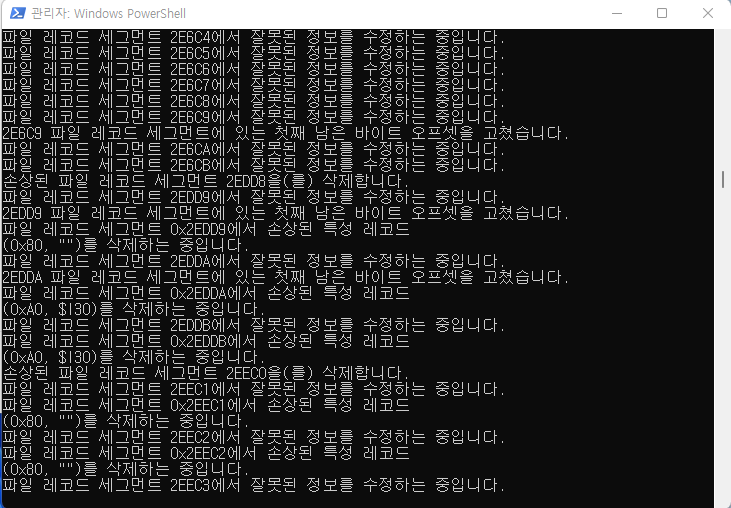 혹시나 해서 다시 한번 CHKDSK 명령을 수행합니다. 이번에는 /r 옵션이 아닌 /f 옵션으로 시도합니다.