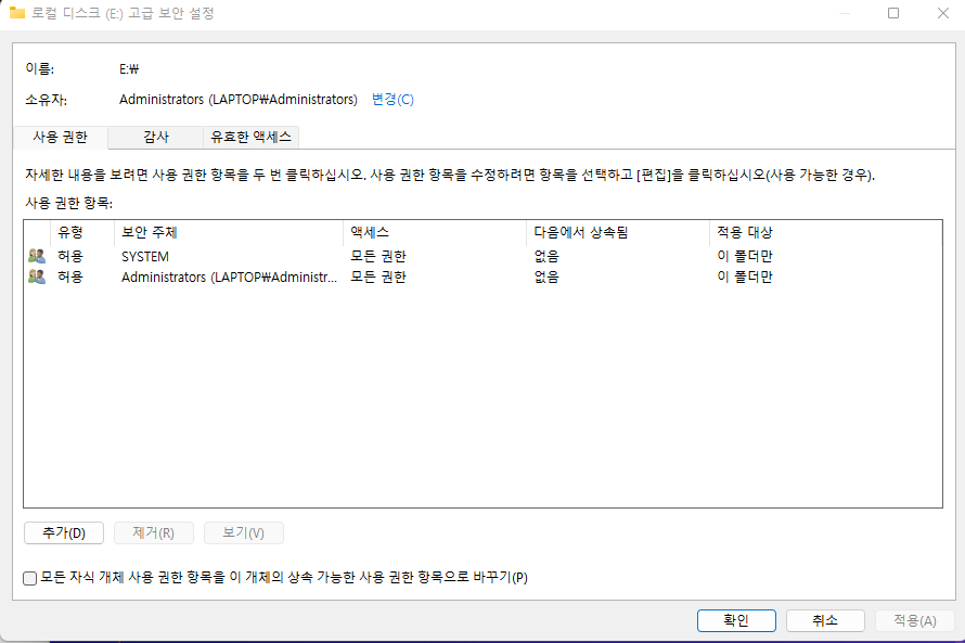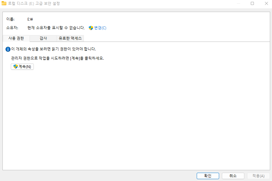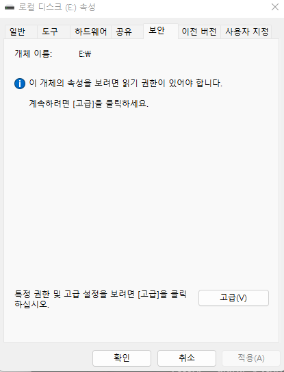 우선 E 드라이브에 권한이 어떻게 되어 있는 지 확인 위해