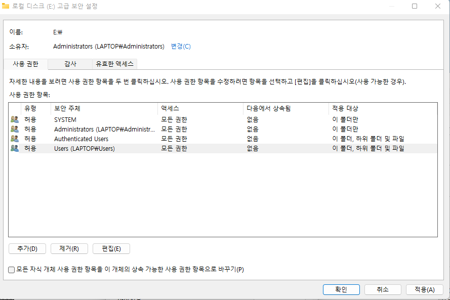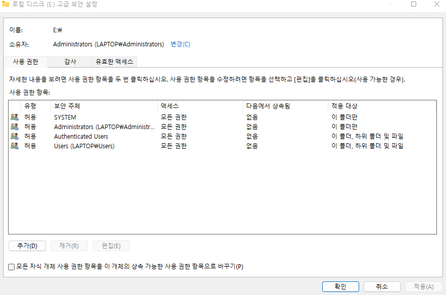 참고로 C 드라이브의 경우 추가로 Autheticated Users, Users 가 권한이 추가된 것을 확인할 수 있습니다.