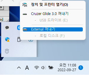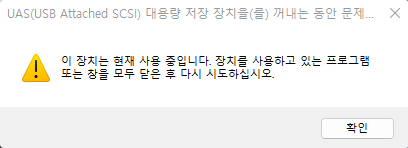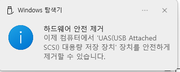 아래와 같이 하드웨어 안전 제거 팝업을 확인 후 장치 제거를 하시길 바랍니다.